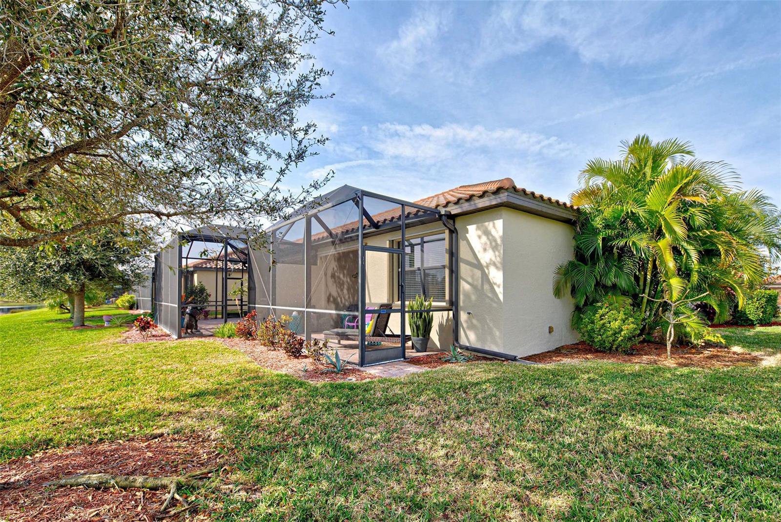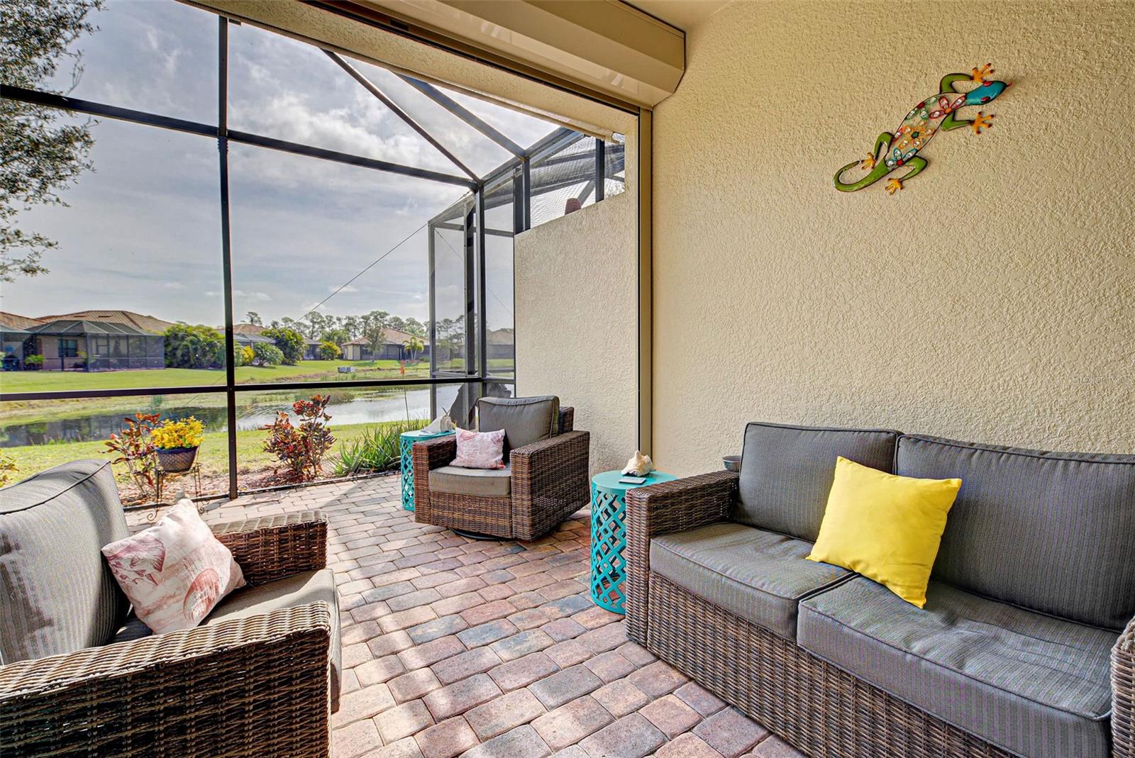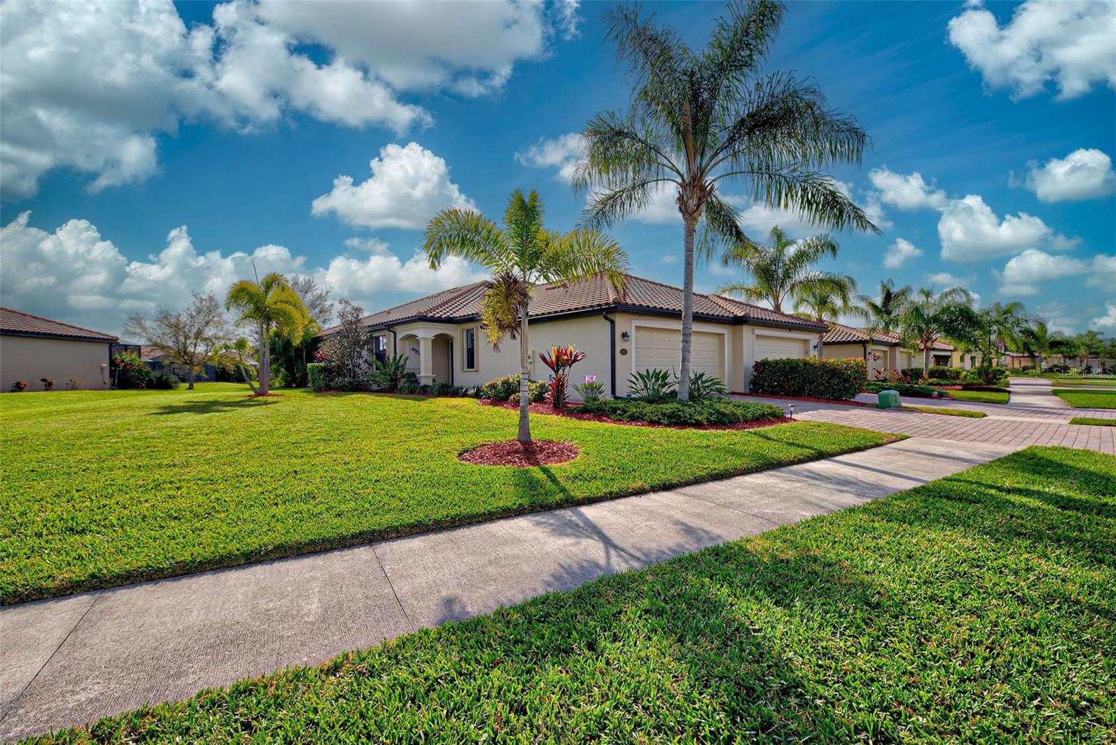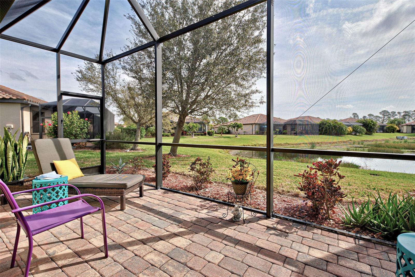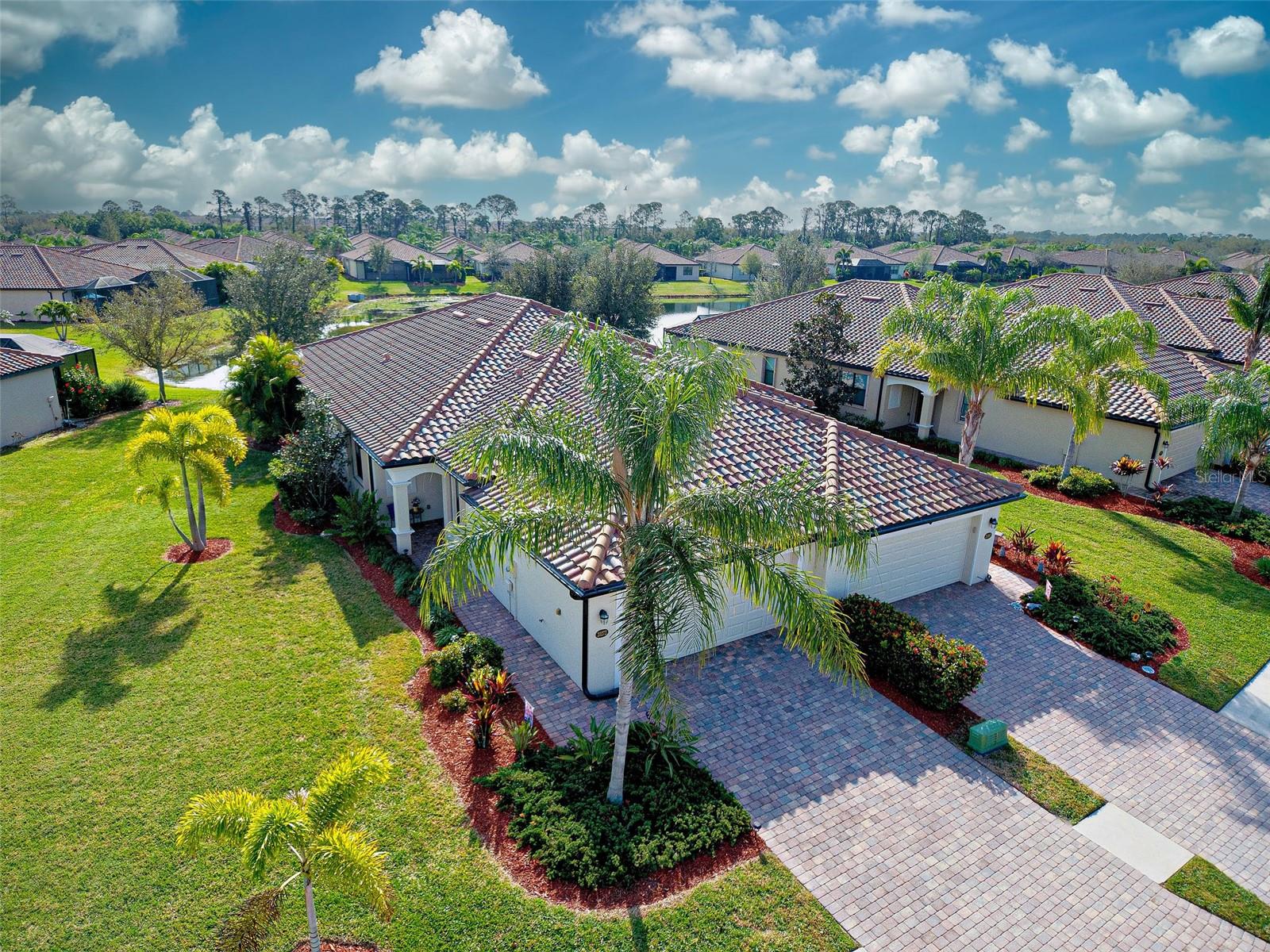 Under contract-accepting backup offers. Check out the beautiful pond view and experience the ultimate in Florida living from the comfort of this exquisite villa within the maintenance-free resort community of Gran Paradiso. Embrace the Orchid model's thoughtful SPLIT FLOOR PLAN design, TWO BEDROOMS AND A DEN with French doors, two baths and 2 CAR GARAGE. Check out the Updated two-car garage that has a StorPro OVERHEAD STORAGE SHELF and a NewAge GARAGE STORAGE CABINET/WORK BENCH with TWO ROLLOUT TOOL BOXES. This home has beautiful finishes such as crown moldings, granite countertops, and diagonally tiled floors, complemented by stainless steel appliances in the kitchen. A new water heater was installed in 2023. NO WORRIES putting up HURRICANE SHUTTERS this villa is equipped with a ROLL DOWN SHUTTER ON the LANAI and ACCORDIAN SHUTTERS ON EACH WINDOW. This villa is NOT IN A FLOOD ZONE and it is situated on one of the FEW OVERSIZED LOTS in Gran Paradiso, this villa offers ample green space and extra space between the villas. Indulge in the resort-like array of amenities, including community activities, a rejuvenating pool, saunas, steam rooms, gym and workout facilities, PICKLE BALL and tennis courts to name a few. Or simply unwind while admiring the pond and the beautiful array of birds from your lanai. Located close to Beaches, shopping, the Braves Winter Training facility and lots of great dining Choices! Call today for your private showing and elevate your living experience in Gran Paradiso's premier community.
