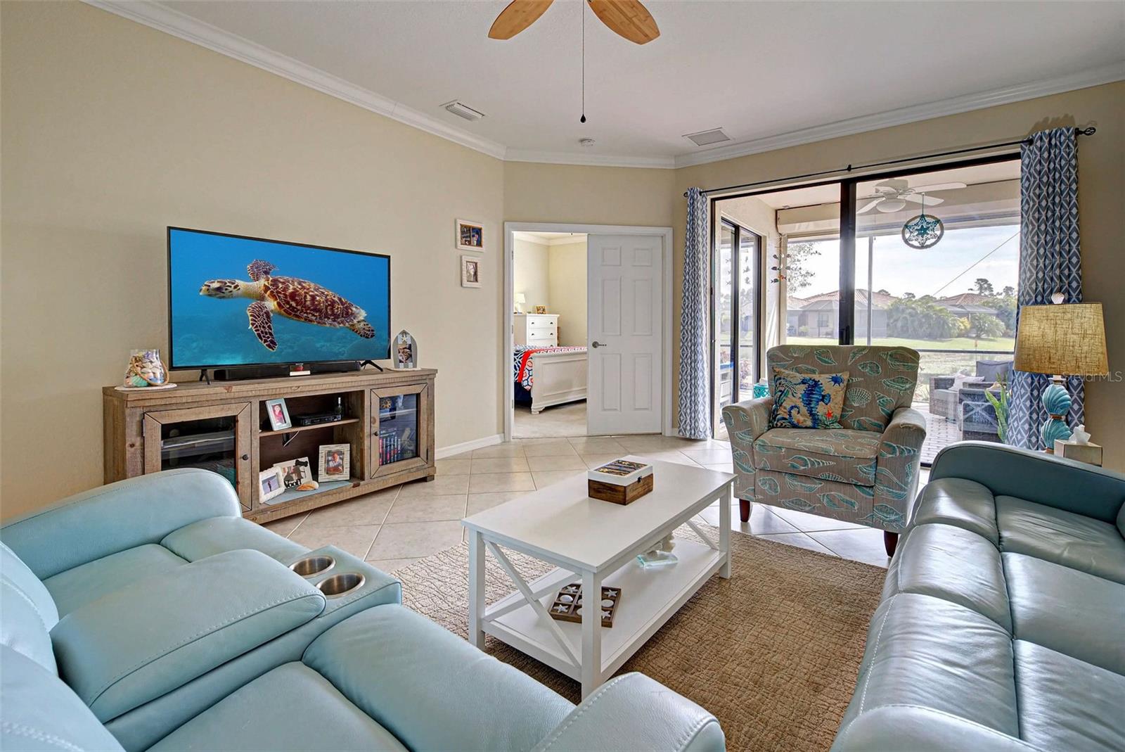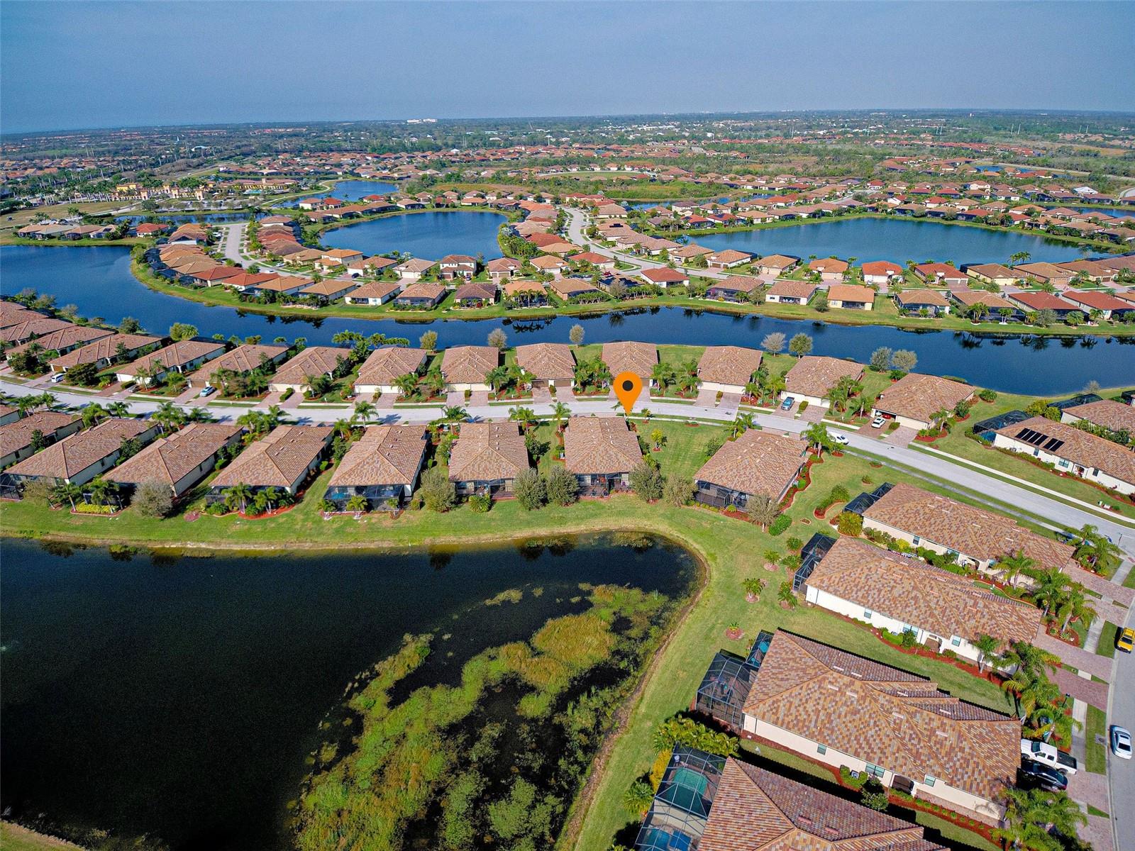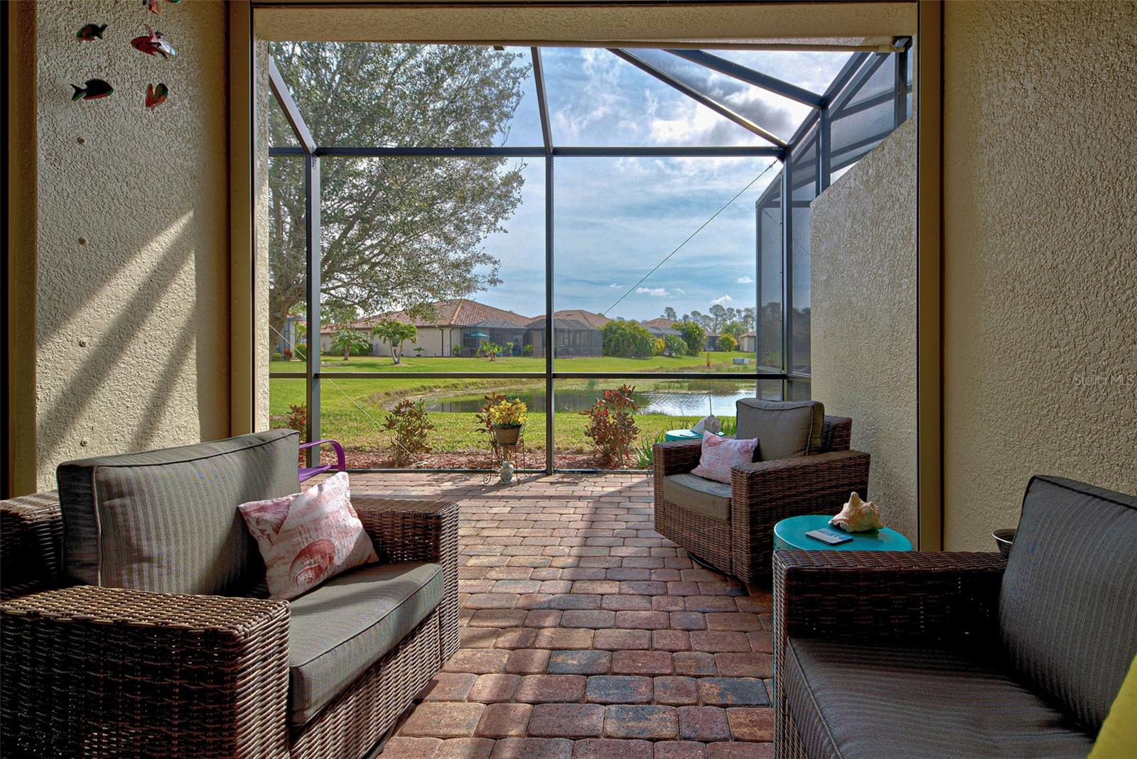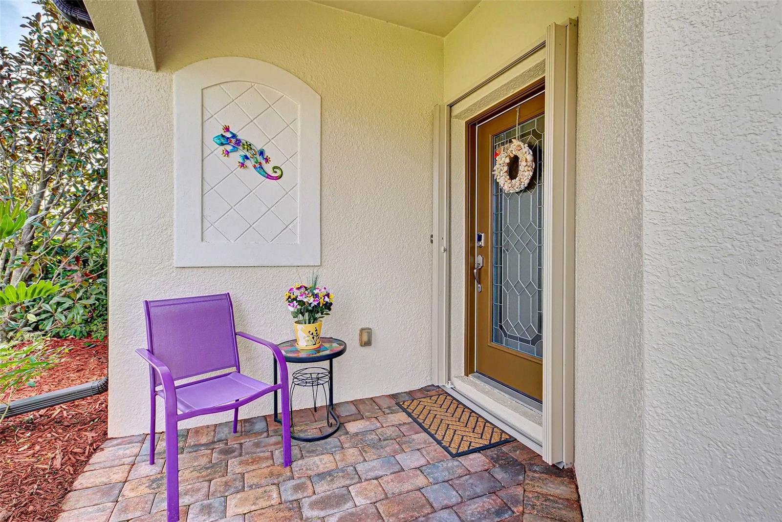 Under contract-accepting backup offers. Check out the beautiful pond view and experience the ultimate in Florida living from the comfort of this exquisite villa within the maintenance-free resort community of Gran Paradiso. Embrace the Orchid model's thoughtful SPLIT FLOOR PLAN design, TWO BEDROOMS AND A DEN with French doors, two baths and 2 CAR GARAGE. Check out the Updated two-car garage that has a StorPro OVERHEAD STORAGE SHELF and a NewAge GARAGE STORAGE CABINET/WORK BENCH with TWO ROLLOUT TOOL BOXES. This home has beautiful finishes such as crown moldings, granite countertops, and diagonally tiled floors, complemented by stainless steel appliances in the kitchen. A new water heater was installed in 2023. NO WORRIES putting up HURRICANE SHUTTERS this villa is equipped with a ROLL DOWN SHUTTER ON the LANAI and ACCORDIAN SHUTTERS ON EACH WINDOW. This villa is NOT IN A FLOOD ZONE and it is situated on one of the FEW OVERSIZED LOTS in Gran Paradiso, this villa offers ample green space and extra space between the villas. Indulge in the resort-like array of amenities, including community activities, a rejuvenating pool, saunas, steam rooms, gym and workout facilities, PICKLE BALL and tennis courts to name a few. Or simply unwind while admiring the pond and the beautiful array of birds from your lanai. Located close to Beaches, shopping, the Braves Winter Training facility and lots of great dining Choices! Call today for your private showing and elevate your living experience in Gran Paradiso's premier community.
