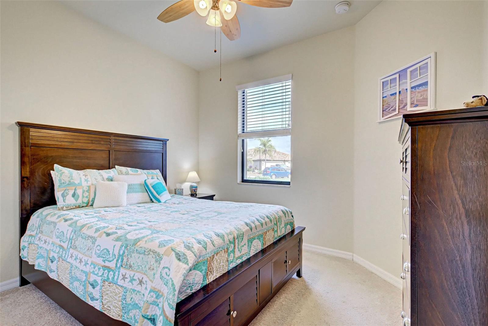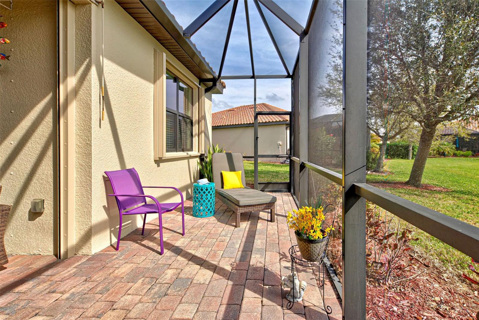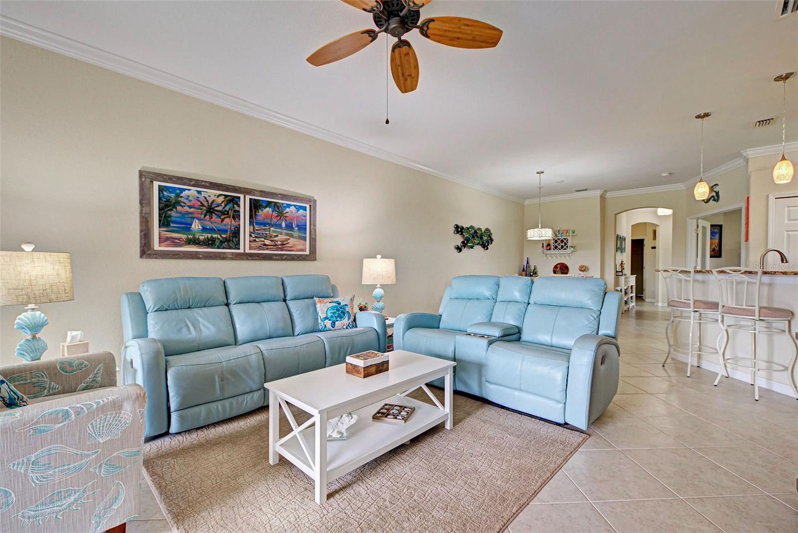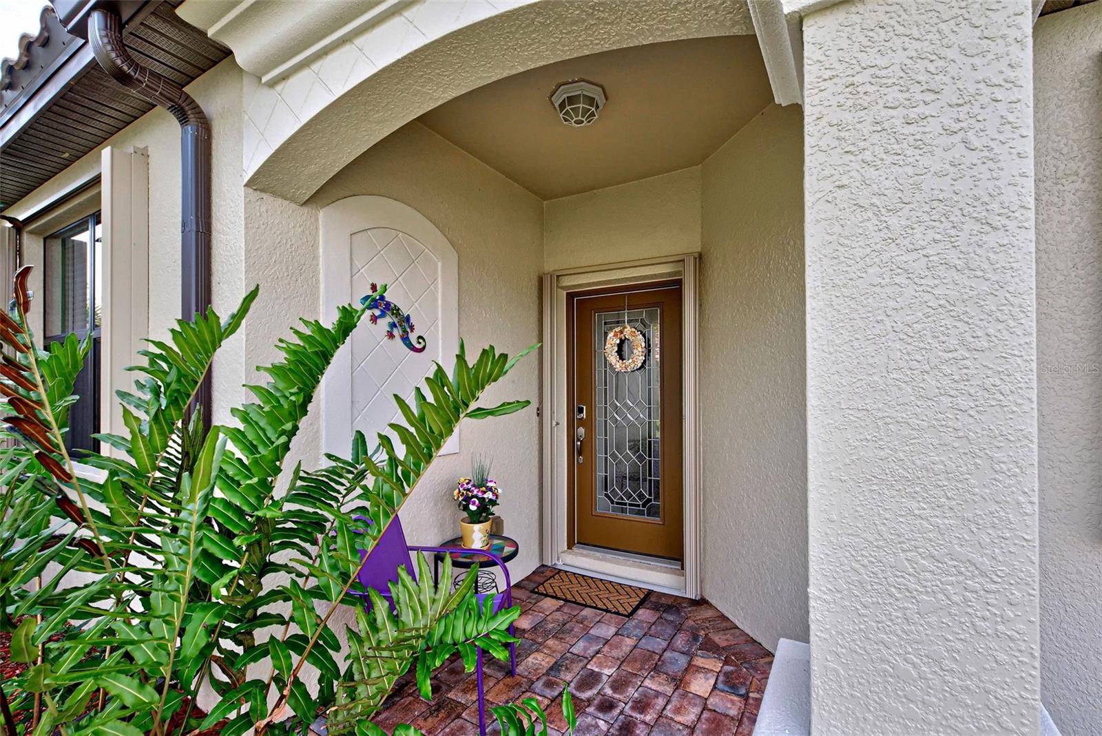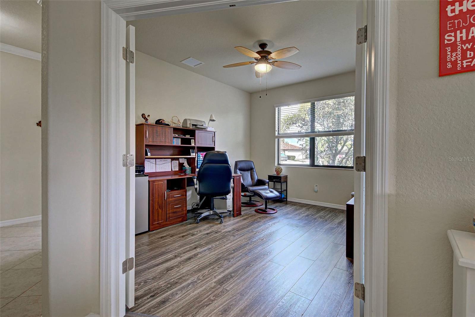 Under contract-accepting backup offers. Check out the beautiful pond view and experience the ultimate in Florida living from the comfort of this exquisite villa within the maintenance-free resort community of Gran Paradiso. Embrace the Orchid model's thoughtful SPLIT FLOOR PLAN design, TWO BEDROOMS AND A DEN with French doors, two baths and 2 CAR GARAGE. Check out the Updated two-car garage that has a StorPro OVERHEAD STORAGE SHELF and a NewAge GARAGE STORAGE CABINET/WORK BENCH with TWO ROLLOUT TOOL BOXES. This home has beautiful finishes such as crown moldings, granite countertops, and diagonally tiled floors, complemented by stainless steel appliances in the kitchen. A new water heater was installed in 2023. NO WORRIES putting up HURRICANE SHUTTERS this villa is equipped with a ROLL DOWN SHUTTER ON the LANAI and ACCORDIAN SHUTTERS ON EACH WINDOW. This villa is NOT IN A FLOOD ZONE and it is situated on one of the FEW OVERSIZED LOTS in Gran Paradiso, this villa offers ample green space and extra space between the villas. Indulge in the resort-like array of amenities, including community activities, a rejuvenating pool, saunas, steam rooms, gym and workout facilities, PICKLE BALL and tennis courts to name a few. Or simply unwind while admiring the pond and the beautiful array of birds from your lanai. Located close to Beaches, shopping, the Braves Winter Training facility and lots of great dining Choices! Call today for your private showing and elevate your living experience in Gran Paradiso's premier community.