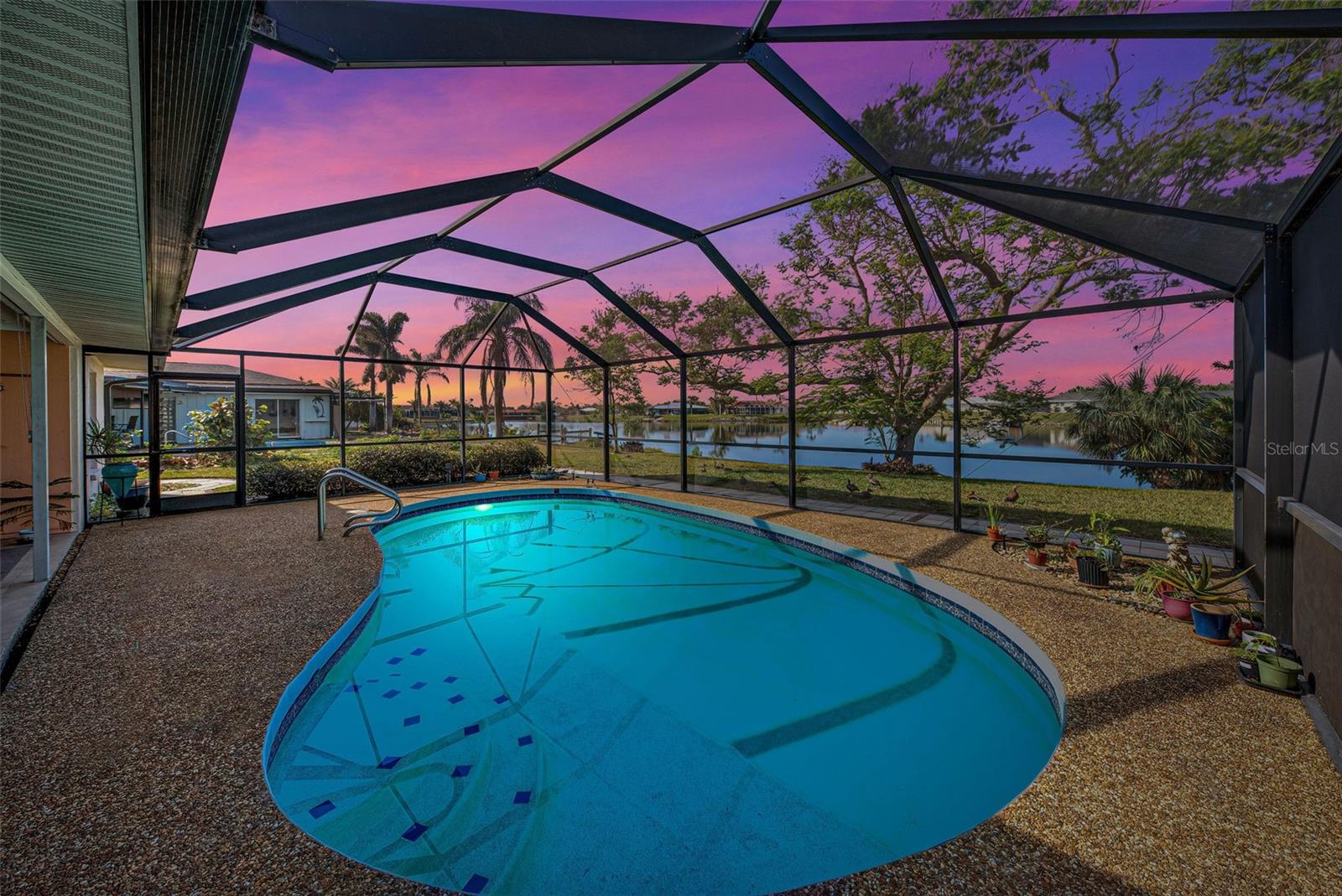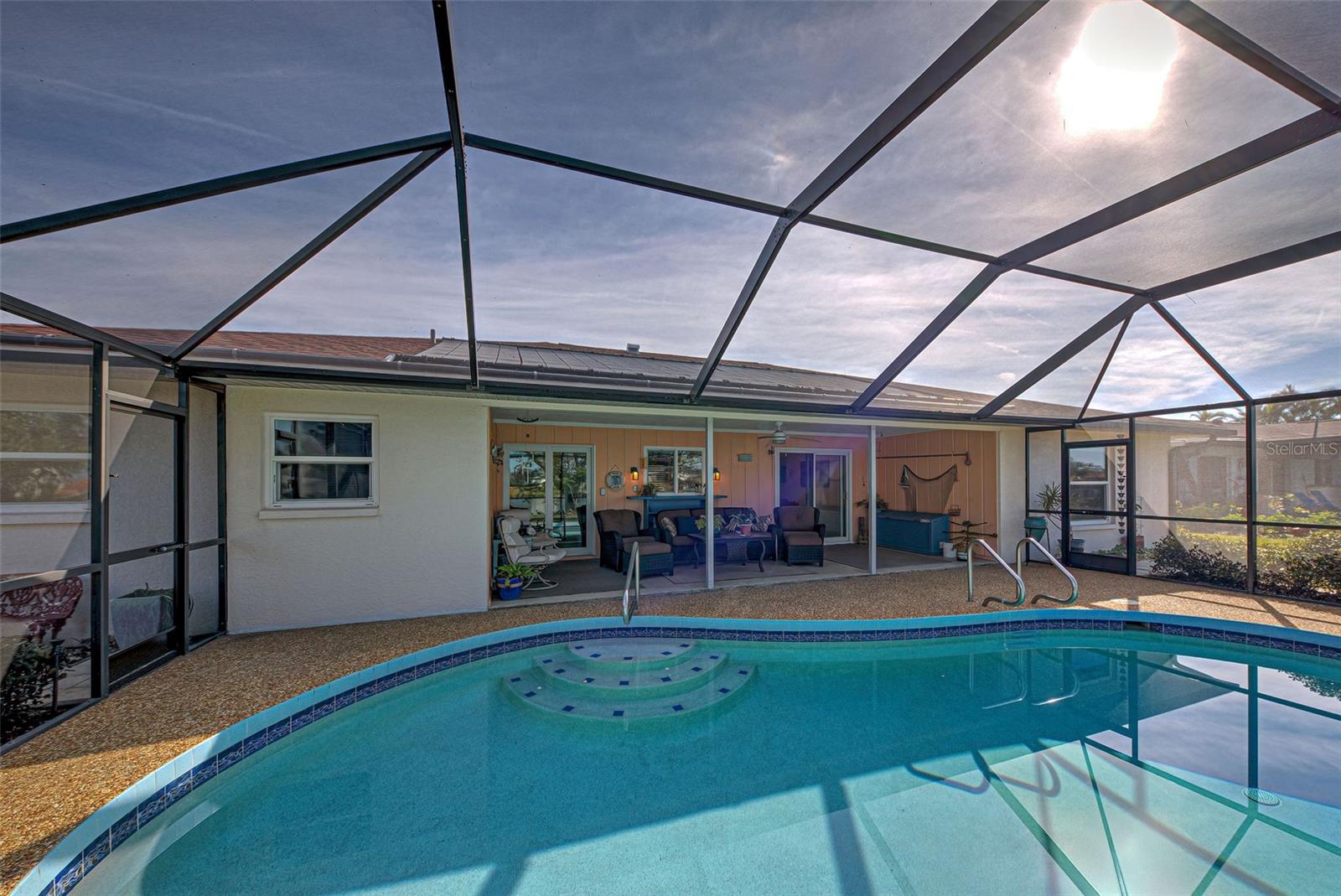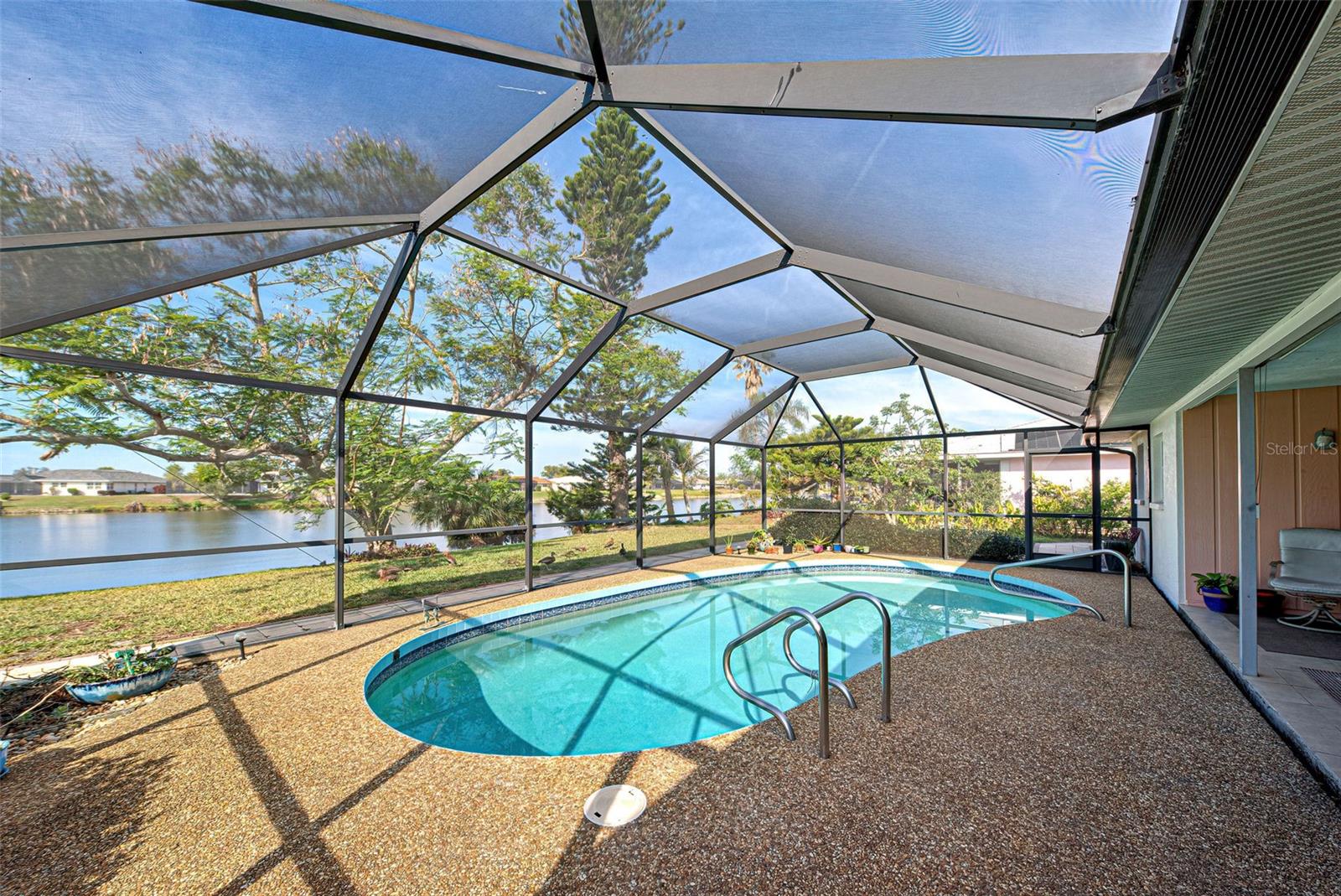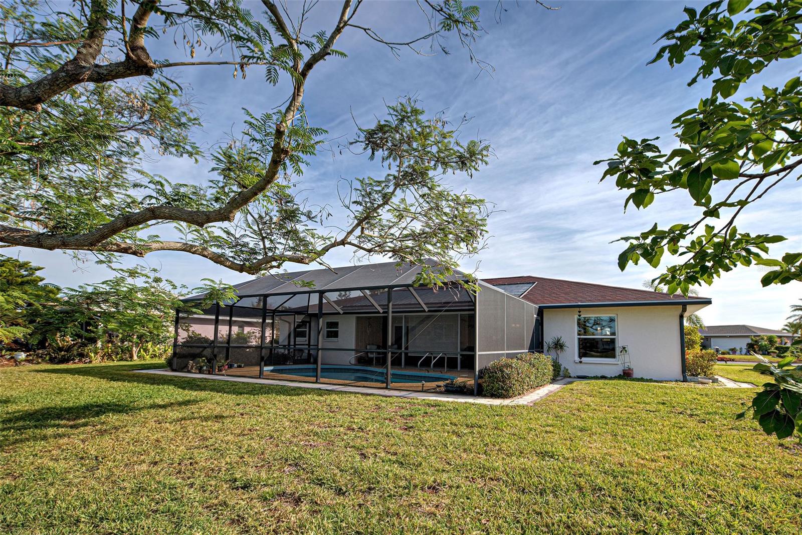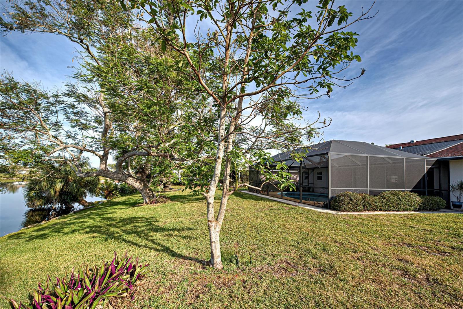 One or more photo(s) has been virtually staged. This home has the view you are looking for! It has a Long Open view of Claw Lake which allows you to get the most out of Florida Sunsets! Relax on the lanai and enjoy the view, birds and the quiet contentment this home brings. You will love it here! This charming 2-bedroom, 2 and 1/2-bath POOL home offers a serene water view of Claw Lake and numerous updates throughout. The Big ticket items have been taken care of! NEW HVAC JUNE 2025, NEW ROOF installed in 2023 and IMPACT RESISTANT WINDOWS bring you peace of mind. The split-bedroom floor plan ensures privacy, while the spacious living areas provide comfort and versatility. The Kitchen has Granite countertops and has been opened up to create an open floor plan. Beautiful glass enclosures update the shower in the Primary Bath and the Jacuzzi tub in the guest bath and bring a contemporary feel. There is also a DEN/OFFICE/3rd Bedroom provides extra space if needed. The salt-water pool is not only a joy but it has new solar heating which will save you money as will the irrigation system that pulls water from the lake. The beautiful lanai and pool area is perfect for social gatherings or just relaxing and living that Florida Lifestyle. The community surrounding Claw lake has some activities throughout the year to include their very own Holiday Boat parade in December to be enjoyed right from your backyard. This Jacaranda West community is Conveniently located near a golf club and this home offers easy access to amenities and recreation. Enjoy all Venice has to offer to include beautiful Beaches, fine dining and shopping. Schedule your showing soon, this is a beautiful home!