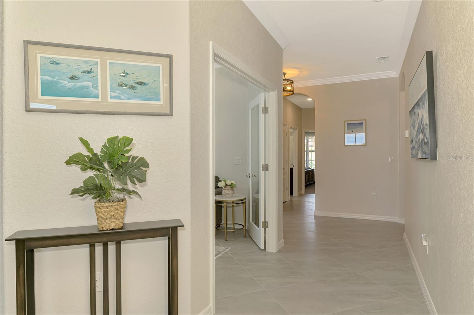 PRICE REDUCED! Seller will pay the entire Golf Course assessment of $15,600! Incredible Waterfront and Golf Course Views from the center of the largest lake in Sarasota National Golf and Country Club includes 2 Golf memberships for the 18-hole Gordon Lewis championship golf course and all amenities. Sarasota National is an Audubon International Certified Signature Sanctuary surrounded by lakes and wetlands with beautiful wildlife. Stylish home comes with Elegant High-End furnishings from Havertys, hosting 2 bedrooms, 2 baths, Den-Office with glass French doors, one of the best lake views and maintenance free. Private screened entrance to 8 ft. beveled glass door leads to the foyer with arched architecture, an extraordinary great room boasting high ceilings with decorative crown molding, Hunter ceiling fan, Whole house water filtration system, New Sun Shade for the 3 sliders. Screened lanai includes Storm Smart electric roll-down Hurricane Shutters leading to a large backyard with room for a pool! Chefs' kitchen with 42-inch wood cabinets, granite counters, deep pot sink, Large Breakfast Island, upgraded stainless steel appliances, new oven with air-fryer, wine refrigerator, glass tile backsplash, under cabinet lighting and walk-in pantry. Spacious dining room has designer lighting and peaceful views of the lake. The king-sized primary suite boasts a large walk-in closet with built-in organizer, a beautiful glass walk-in shower, dual sink vanity with granite counters and private water closet. Separate guest area bedroom and new designer glass shower in the bath.The entire home is freshly painted with neutral colors, stylish lighting, custom window treatments, large tile on the diagonal throughout with carpet in the bedrooms, inside laundry has built-in sink and cabinets for storage, Security system, 2 car garage with sealed brick paver driveway and lanai. Fantastic open floor plan, perfect for entertaining! Amazing Amenity Campus has state-of-the-art clubhouse, 3 full-service restaurants, coffee lounge with TV's-internet-library and pool side "Tiki Bar" to watch your favorite sports. "Dragonflies" on site Spa for facials and massage, well-appointed fitness center, locker room-showers and instructed classes, Resort style swimming pool, lap pool, water aerobics, tennis, pickle ball, bocce ball, playground, 2 dog parks and managed events for you to enjoy! Sarasota National is located close to the Atlanta Braves Spring training facility, Wellen Park for shopping and restaurants, historical downtown Venice and beautiful beaches. Call today for your private appointment to view this exceptional home!