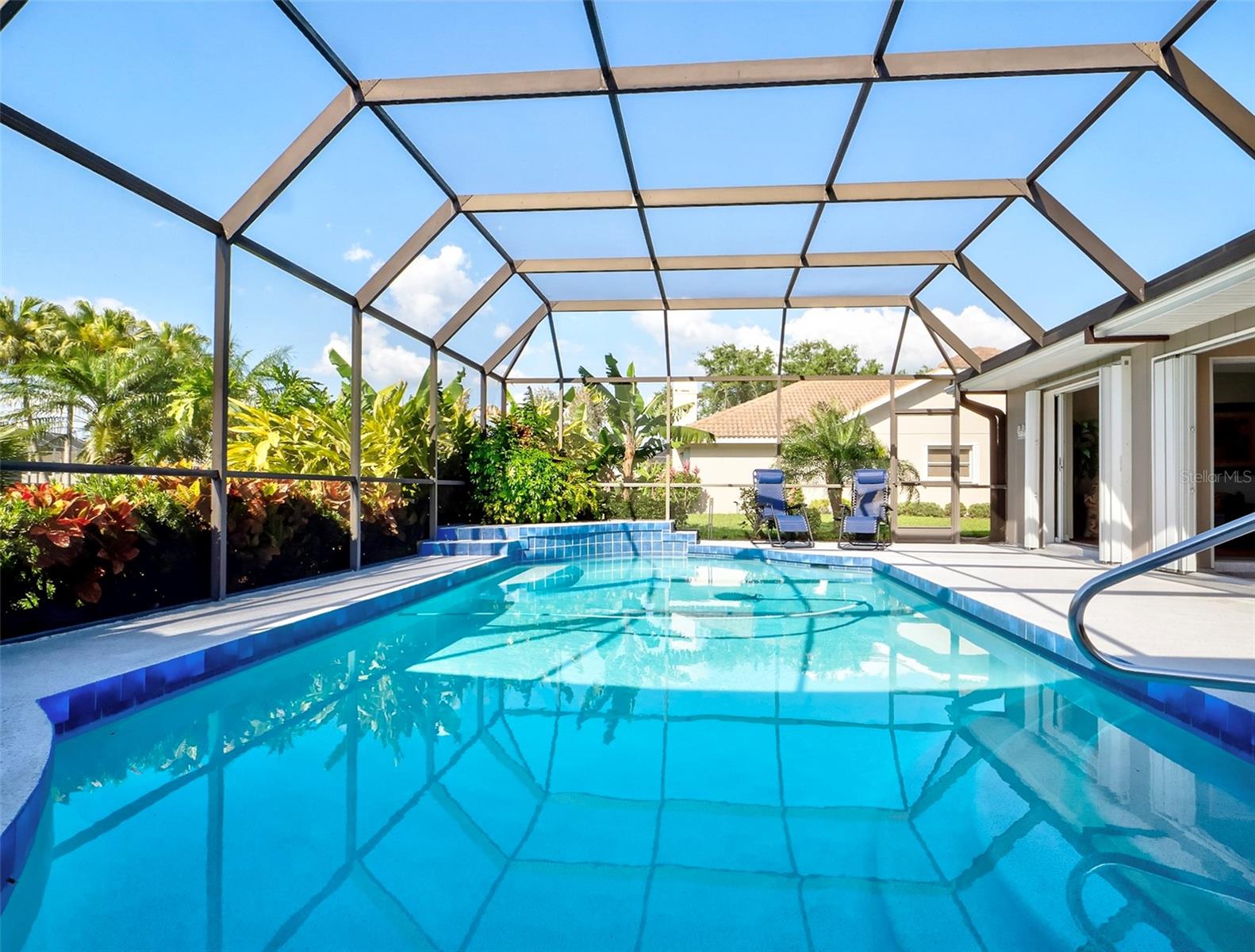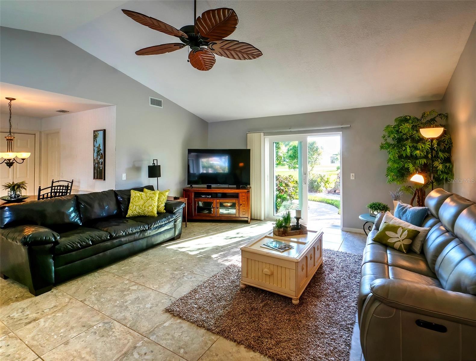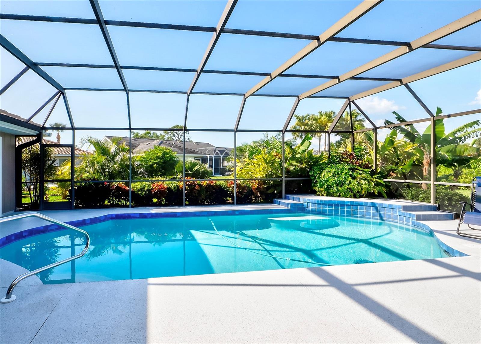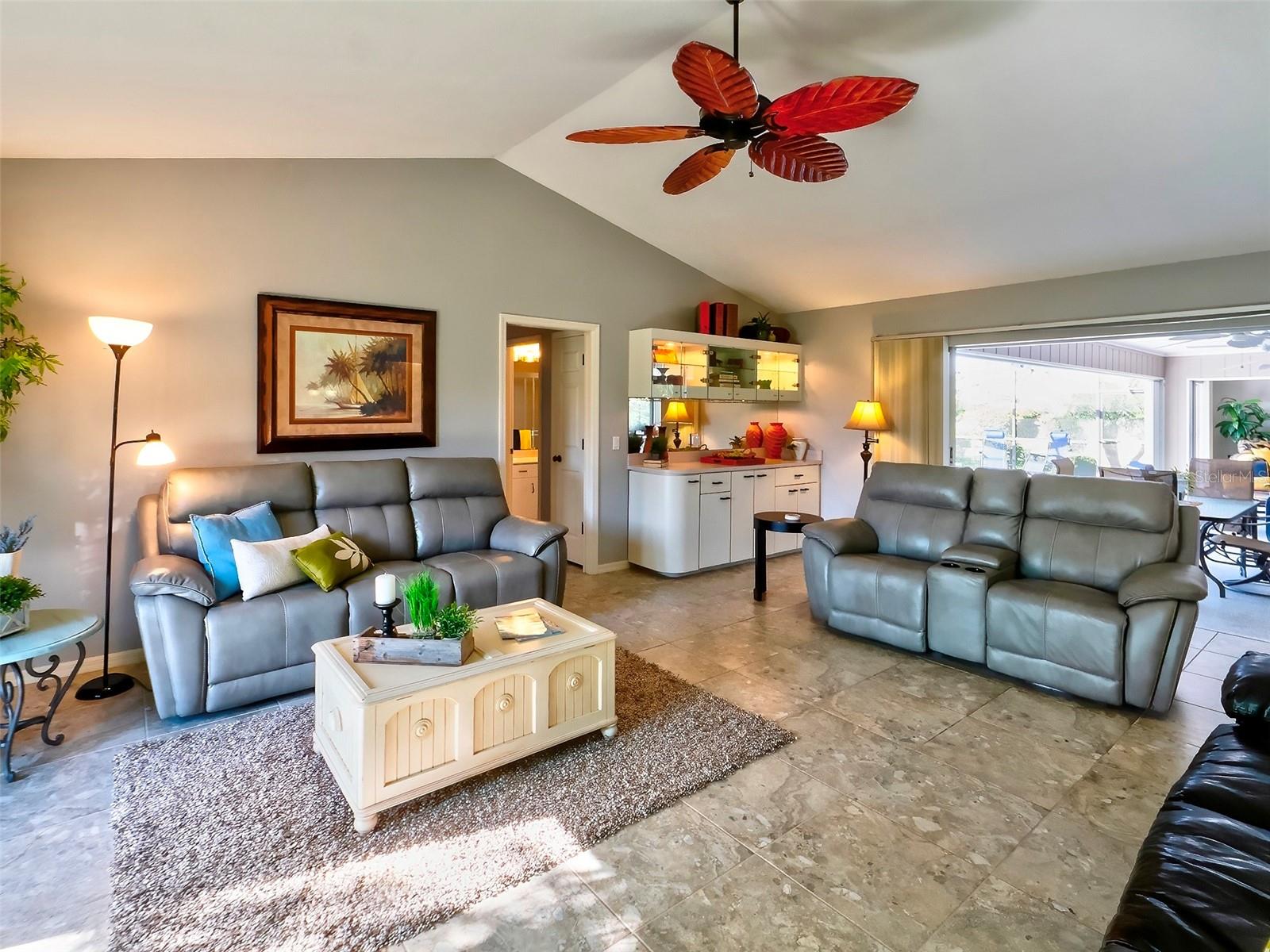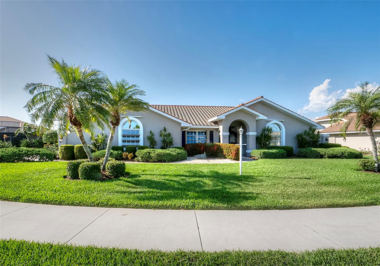 Spacious and thoughtfully designed, this 3 bedroom, 2 bath saltwater pool home features an expansive layout with generously sized rooms throughout. With over 90 feet of frontage and a side-entry garage, the home offers fantastic curb appeal. The spacious master suite features sliding doors that open directly to the pool deck, creating a seamless indoor-outdoor retreat. The en-suite bath offers a jetted garden tub, a walk-in shower, and dual vanities, providing both luxury and convenience. This home is filled with exceptional features, including a double-door entry, soaring cathedral ceilings, and a spacious eat-in kitchen with a breakfast bar and convenient pool pass-through. Additional highlights include elegant plantation shutters, a central vacuum system, separate living and family rooms, and a well-designed split-floor plan for added privacy and functionality. Hurricane shutters throughout provide added security. Step outside to your private oasis, where the sparkling heated saltwater pool overlooks the tropical lush landscape, providing both tranquility and privacy. Nestled in an outstanding gated golf course community with clubhouse, pool & spa, pickleball, tennis, and library, you'll enjoy easy access to shopping, medical facilities, downtown Venice, and the beautiful Gulf beaches. This home comes turnkey furnished- all you need to bring is your tooth brush. Luxurious entertainment room: watch your favourite sports and movies on the 65" tv with two high-end recliner sofas. Don't miss this exceptional opportunity!
