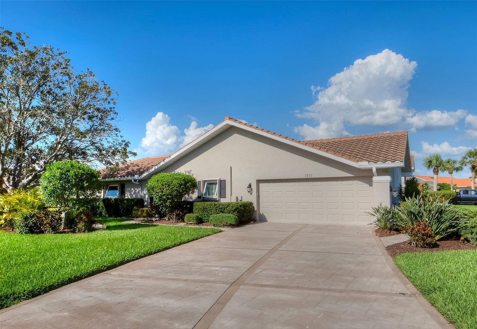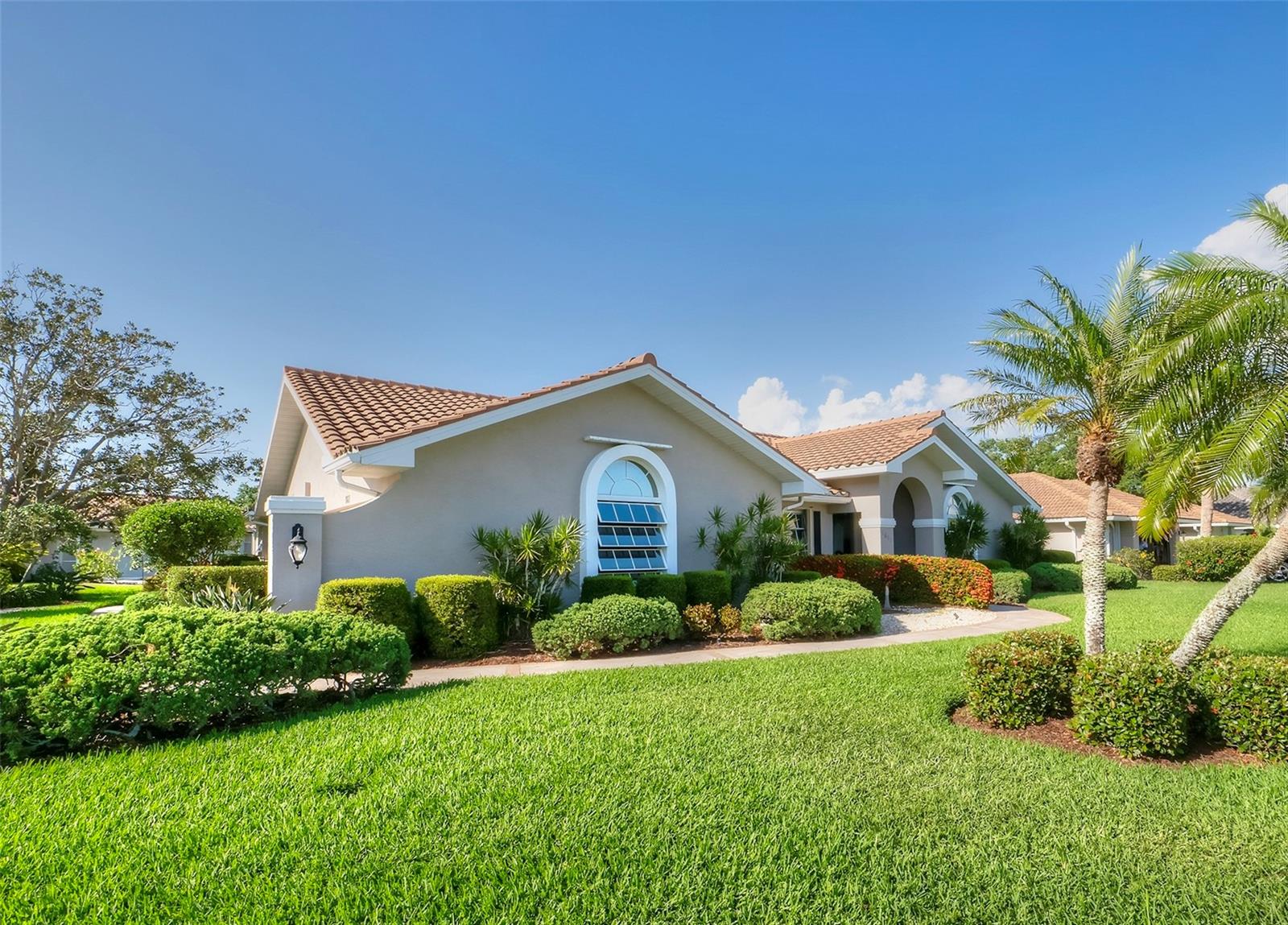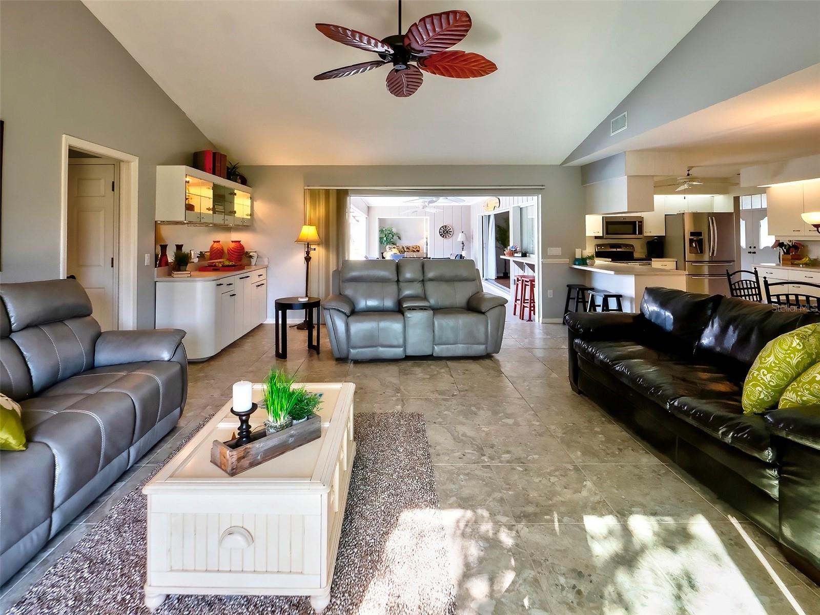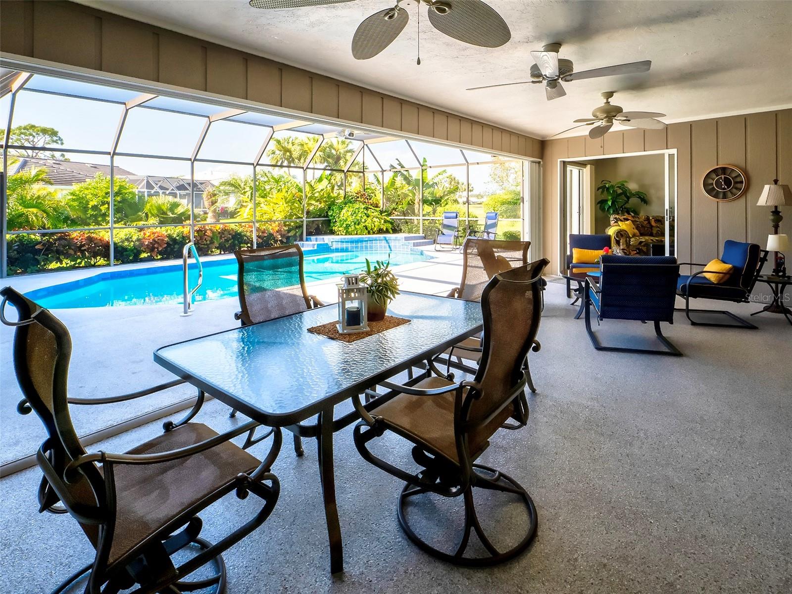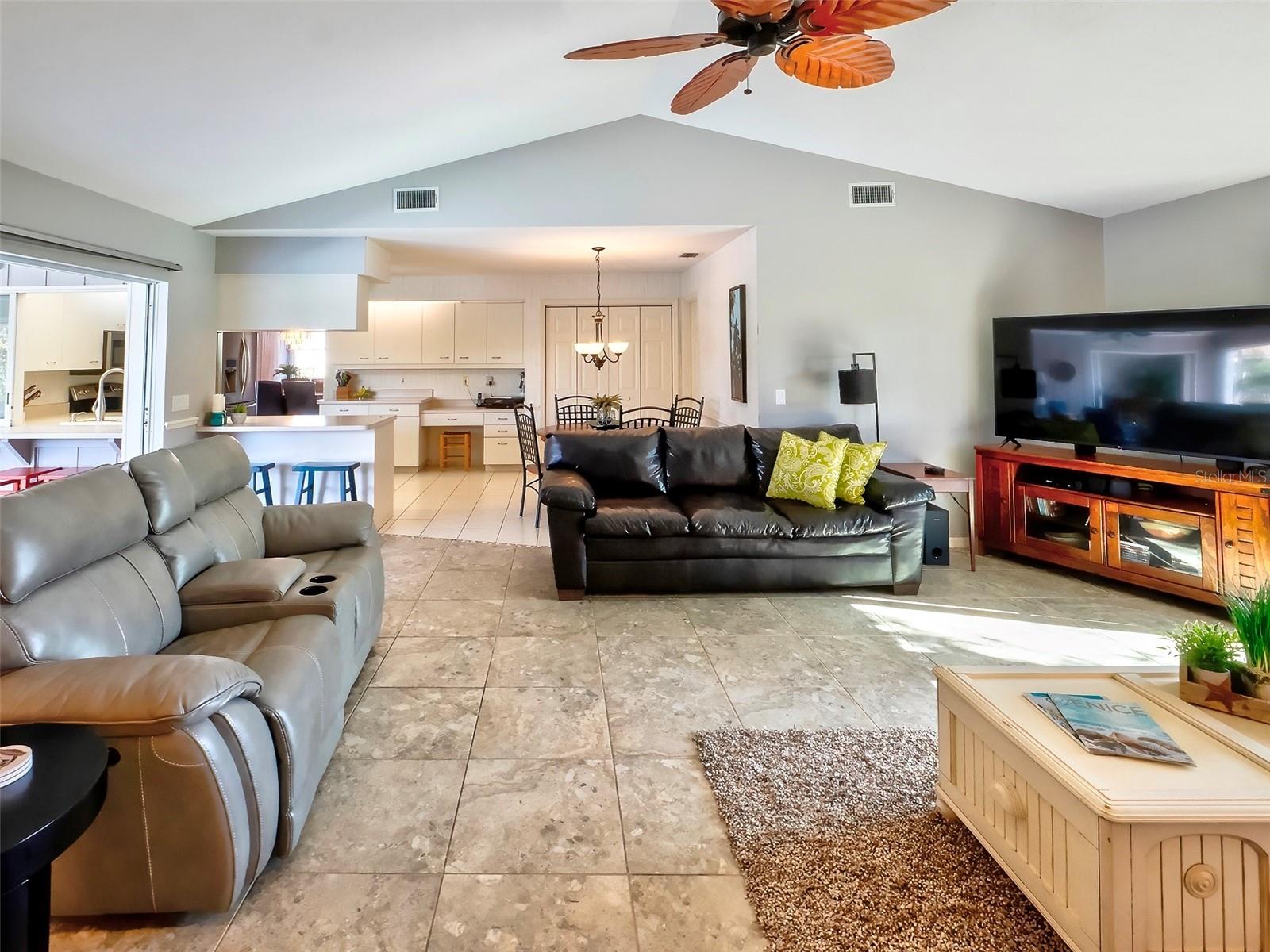Spacious and thoughtfully designed, this 3 bedroom, 2 bath saltwater pool home features an expansive layout with generously sized rooms throughout. With over 90 feet of frontage and a side-entry garage, the home offers fantastic curb appeal. The spacious master suite features sliding doors that open directly to the pool deck, creating a seamless indoor-outdoor retreat. The en-suite bath offers a jetted garden tub, a walk-in shower, and dual vanities, providing both luxury and convenience. This home is filled with exceptional features, including a double-door entry, soaring cathedral ceilings, and a spacious eat-in kitchen with a breakfast bar and convenient pool pass-through. Additional highlights include elegant plantation shutters, a central vacuum system, separate living and family rooms, and a well-designed split-floor plan for added privacy and functionality. Hurricane shutters throughout provide added security. Step outside to your private oasis, where the sparkling heated saltwater pool overlooks the tropical lush landscape, providing both tranquility and privacy. Nestled in an outstanding gated golf course community with clubhouse, pool & spa, pickleball, tennis, and library, you'll enjoy easy access to shopping, medical facilities, downtown Venice, and the beautiful Gulf beaches. This home comes turnkey furnished- all you need to bring is your tooth brush. Luxurious entertainment room: watch your favourite sports and movies on the 65" tv with two high-end recliner sofas. Don't miss this exceptional opportunity!