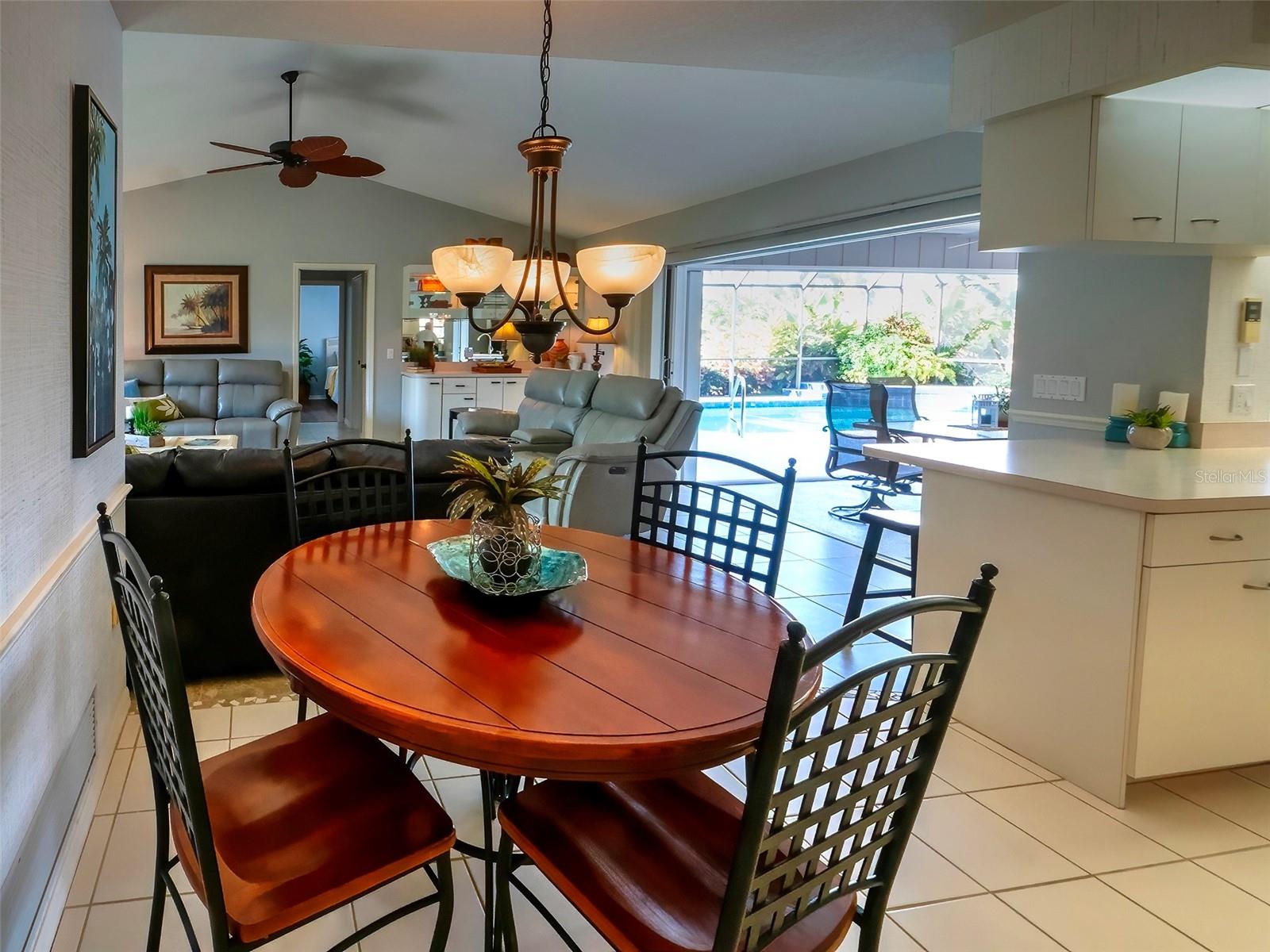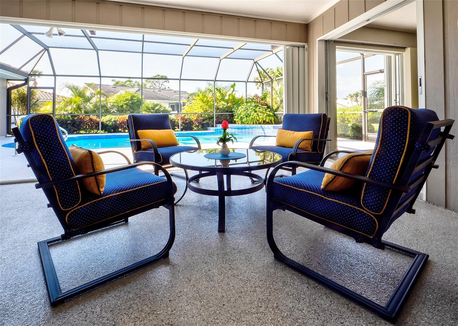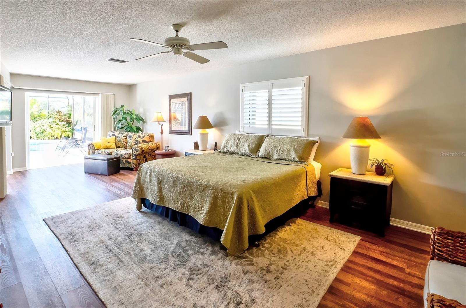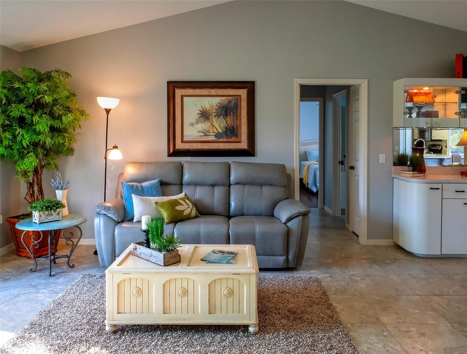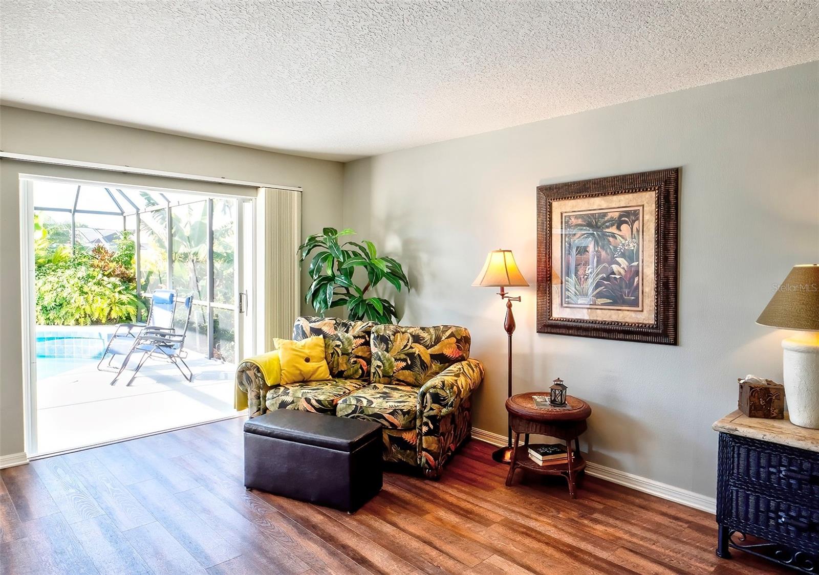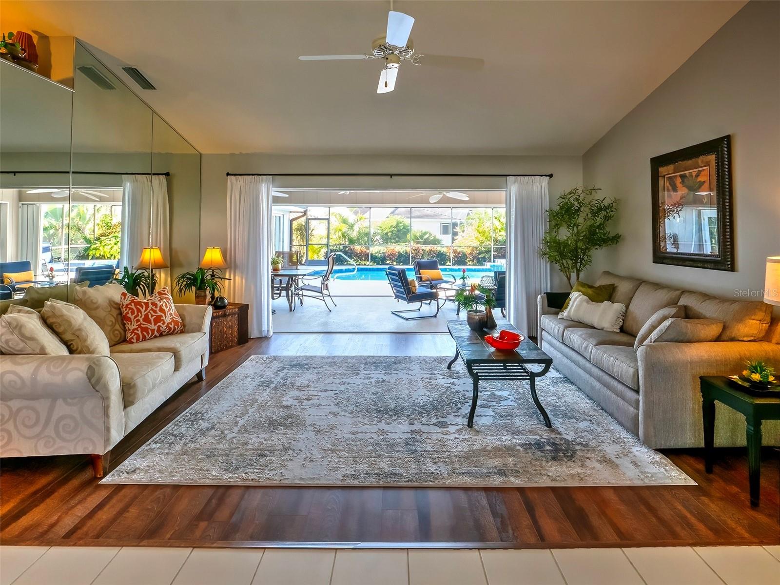 Spacious and thoughtfully designed, this 3 bedroom, 2 bath saltwater pool home features an expansive layout with generously sized rooms throughout. With over 90 feet of frontage and a side-entry garage, the home offers fantastic curb appeal. The spacious master suite features sliding doors that open directly to the pool deck, creating a seamless indoor-outdoor retreat. The en-suite bath offers a jetted garden tub, a walk-in shower, and dual vanities, providing both luxury and convenience. This home is filled with exceptional features, including a double-door entry, soaring cathedral ceilings, and a spacious eat-in kitchen with a breakfast bar and convenient pool pass-through. Additional highlights include elegant plantation shutters, a central vacuum system, separate living and family rooms, and a well-designed split-floor plan for added privacy and functionality. Hurricane shutters throughout provide added security. Step outside to your private oasis, where the sparkling heated saltwater pool overlooks the tropical lush landscape, providing both tranquility and privacy. Nestled in an outstanding gated golf course community with clubhouse, pool & spa, pickleball, tennis, and library, you'll enjoy easy access to shopping, medical facilities, downtown Venice, and the beautiful Gulf beaches. This home comes turnkey furnished- all you need to bring is your tooth brush. Luxurious entertainment room: watch your favourite sports and movies on the 65" tv with two high-end recliner sofas. Don't miss this exceptional opportunity!