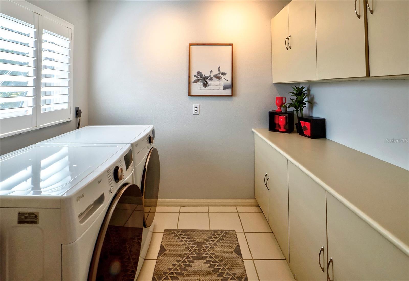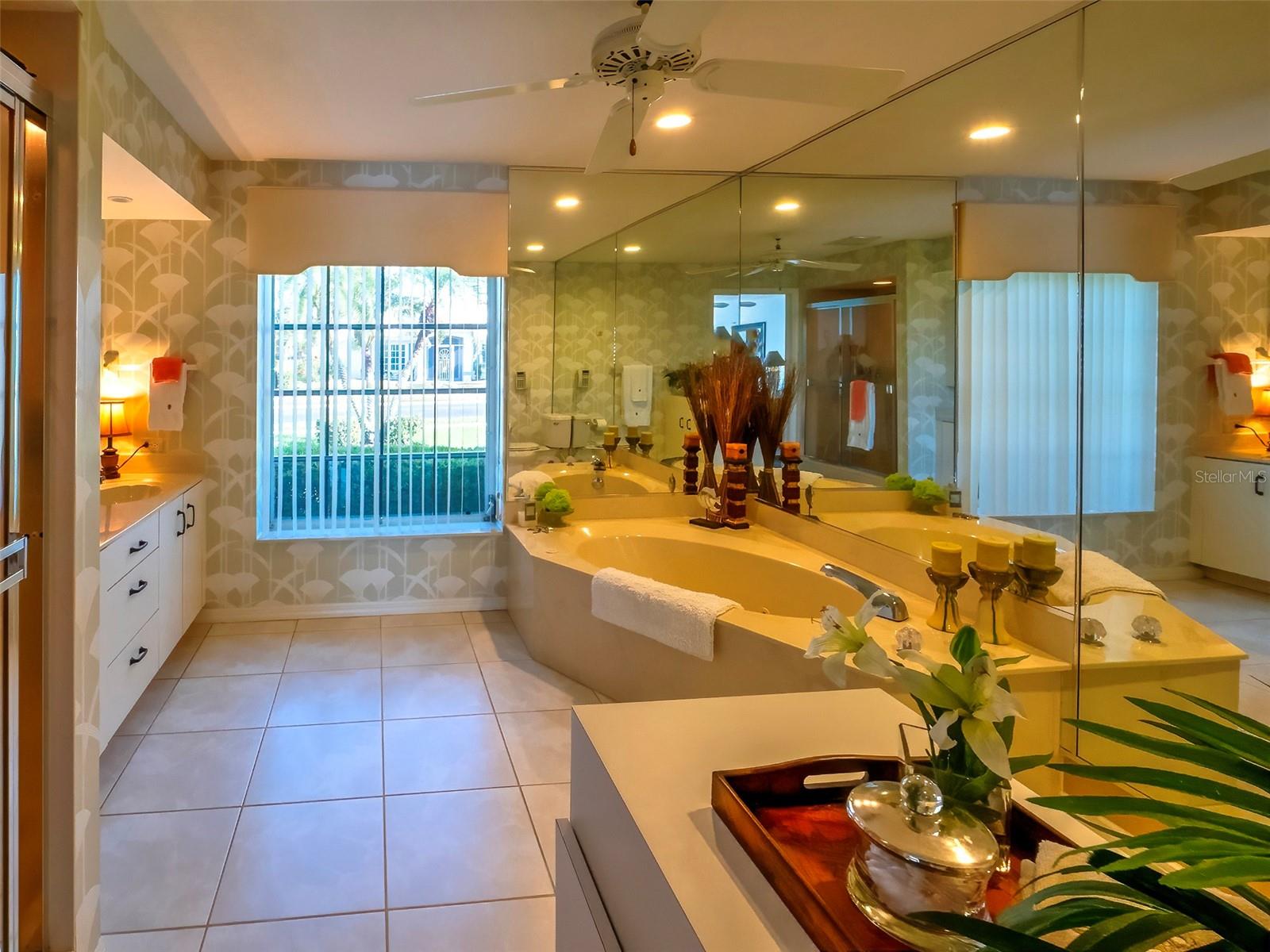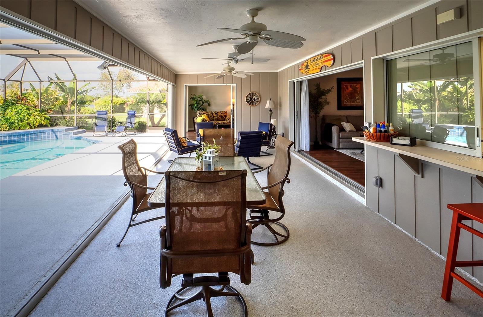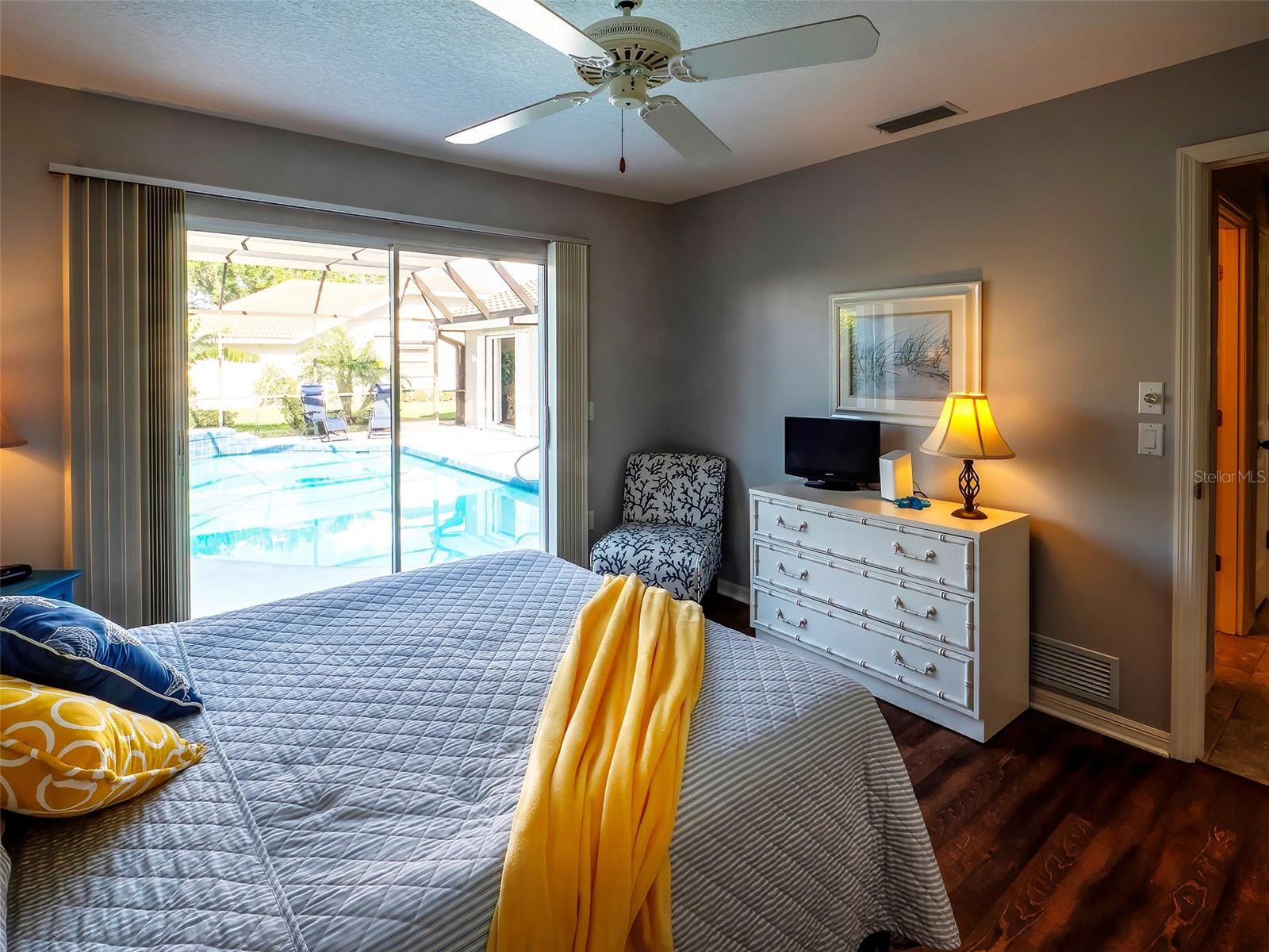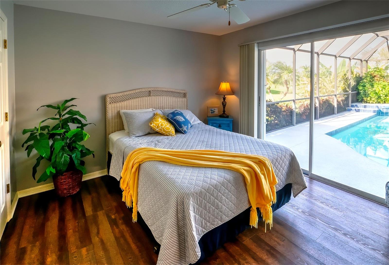 Spacious and thoughtfully designed, this 3 bedroom, 2 bath saltwater pool home features an expansive layout with generously sized rooms throughout. With over 90 feet of frontage and a side-entry garage, the home offers fantastic curb appeal. The spacious master suite features sliding doors that open directly to the pool deck, creating a seamless indoor-outdoor retreat. The en-suite bath offers a jetted garden tub, a walk-in shower, and dual vanities, providing both luxury and convenience. This home is filled with exceptional features, including a double-door entry, soaring cathedral ceilings, and a spacious eat-in kitchen with a breakfast bar and convenient pool pass-through. Additional highlights include elegant plantation shutters, a central vacuum system, separate living and family rooms, and a well-designed split-floor plan for added privacy and functionality. Hurricane shutters throughout provide added security. Step outside to your private oasis, where the sparkling heated saltwater pool overlooks the tropical lush landscape, providing both tranquility and privacy. Nestled in an outstanding gated golf course community with clubhouse, pool & spa, pickleball, tennis, and library, you'll enjoy easy access to shopping, medical facilities, downtown Venice, and the beautiful Gulf beaches. This home comes turnkey furnished- all you need to bring is your tooth brush. Luxurious entertainment room: watch your favourite sports and movies on the 65" tv with two high-end recliner sofas. Don't miss this exceptional opportunity!