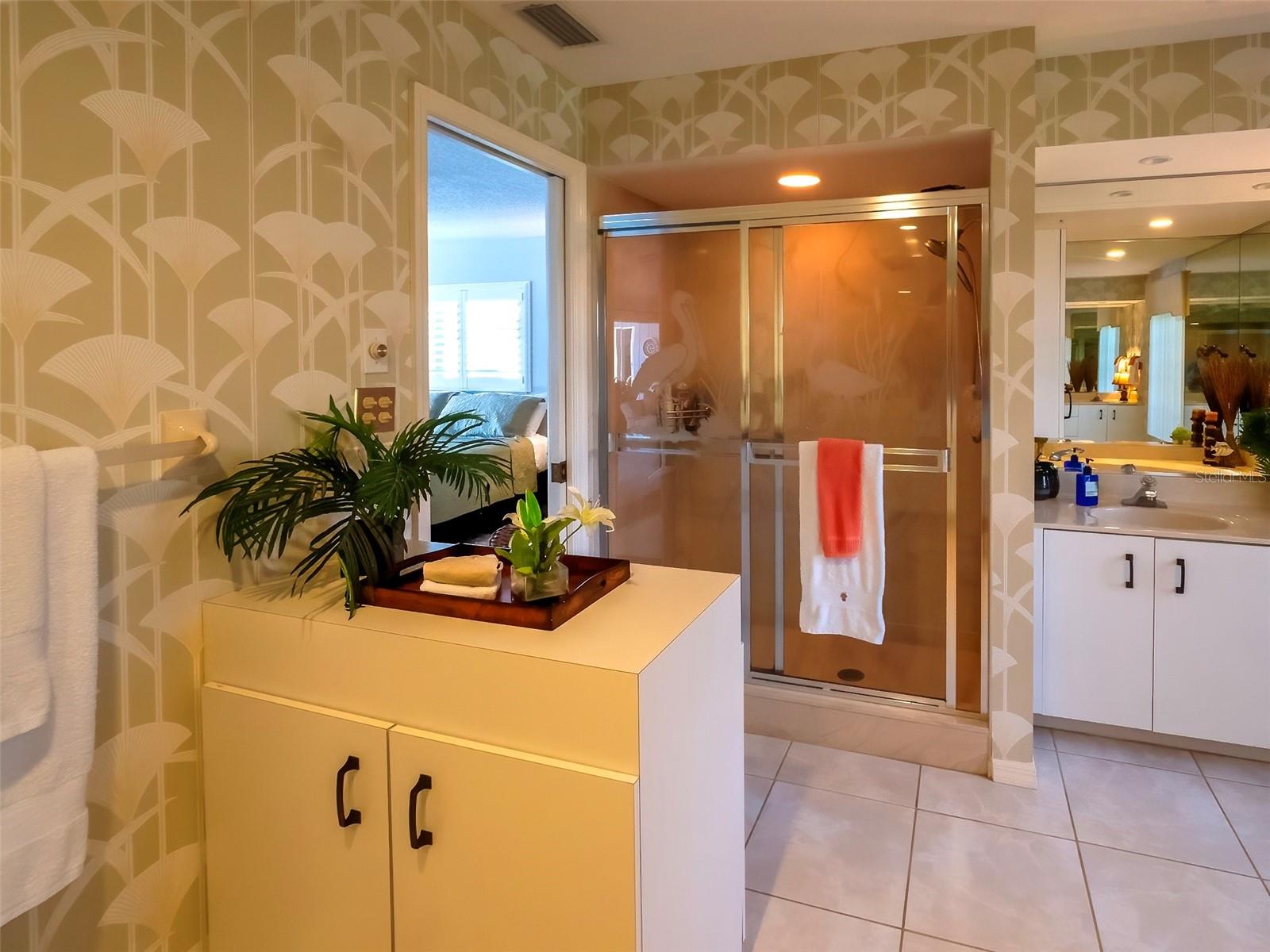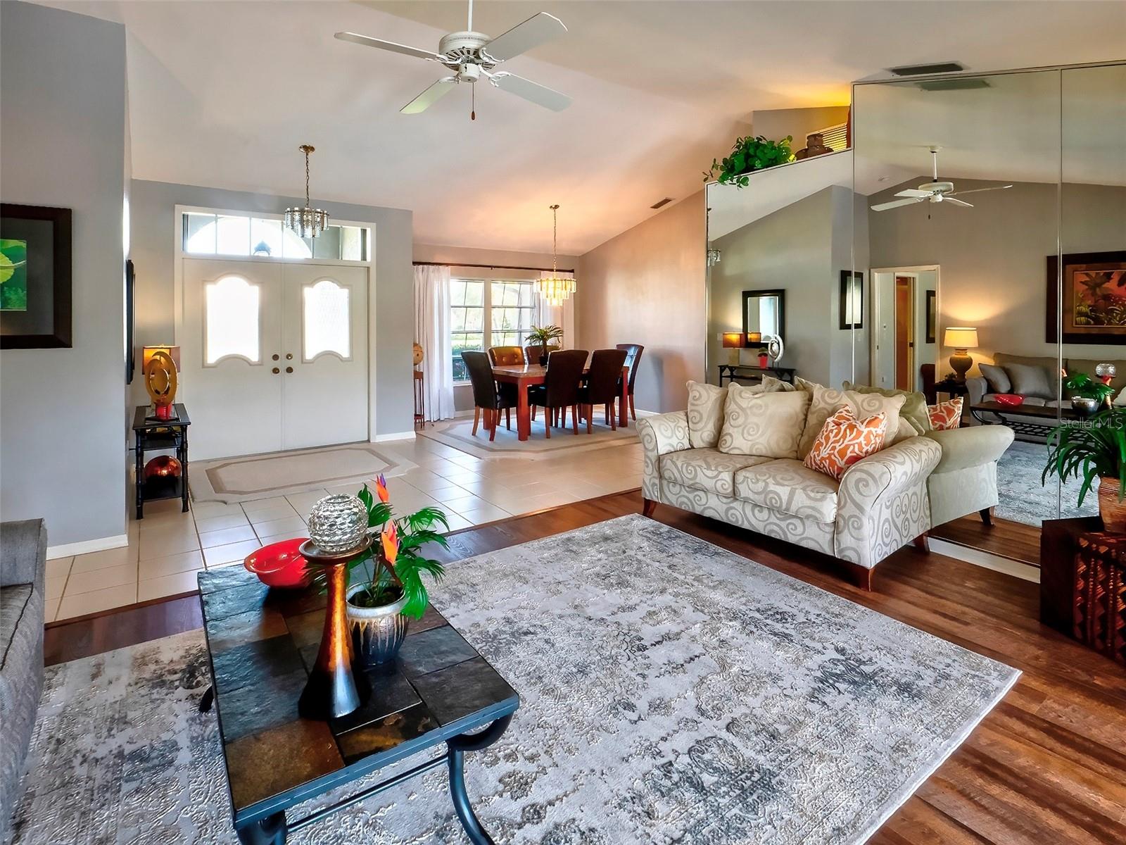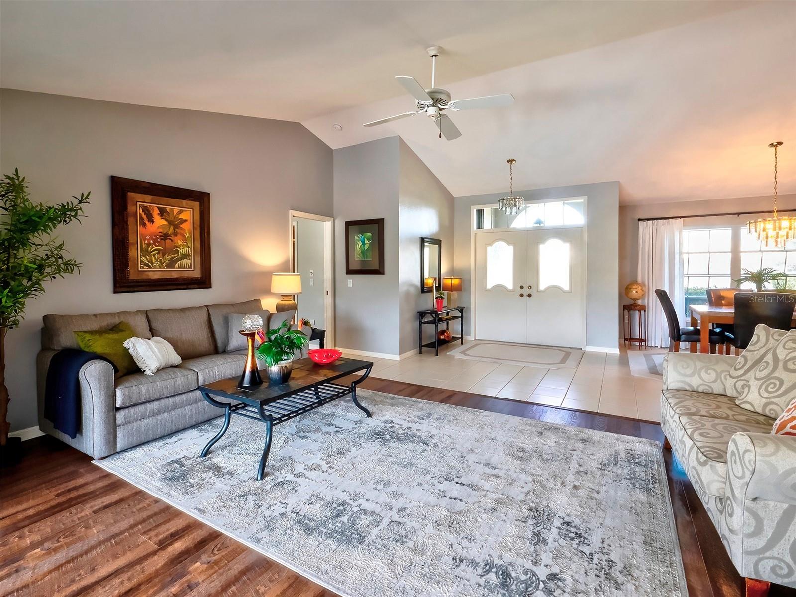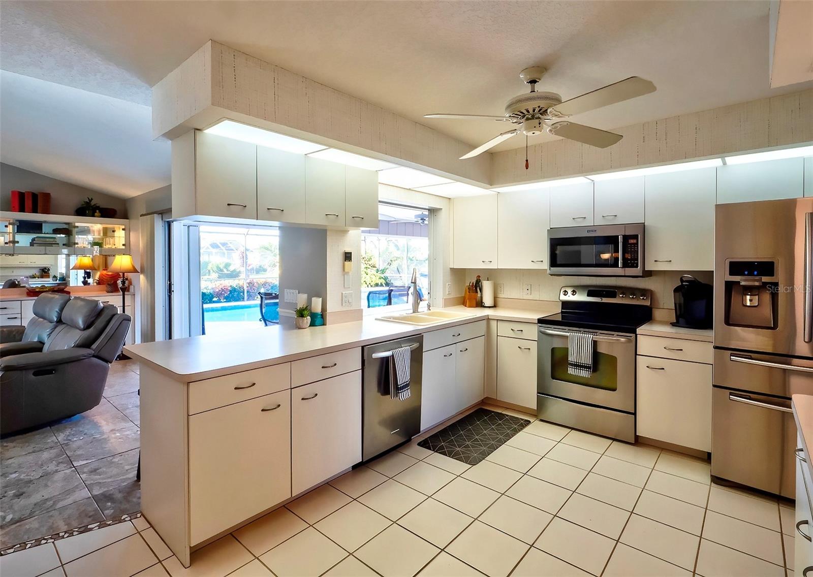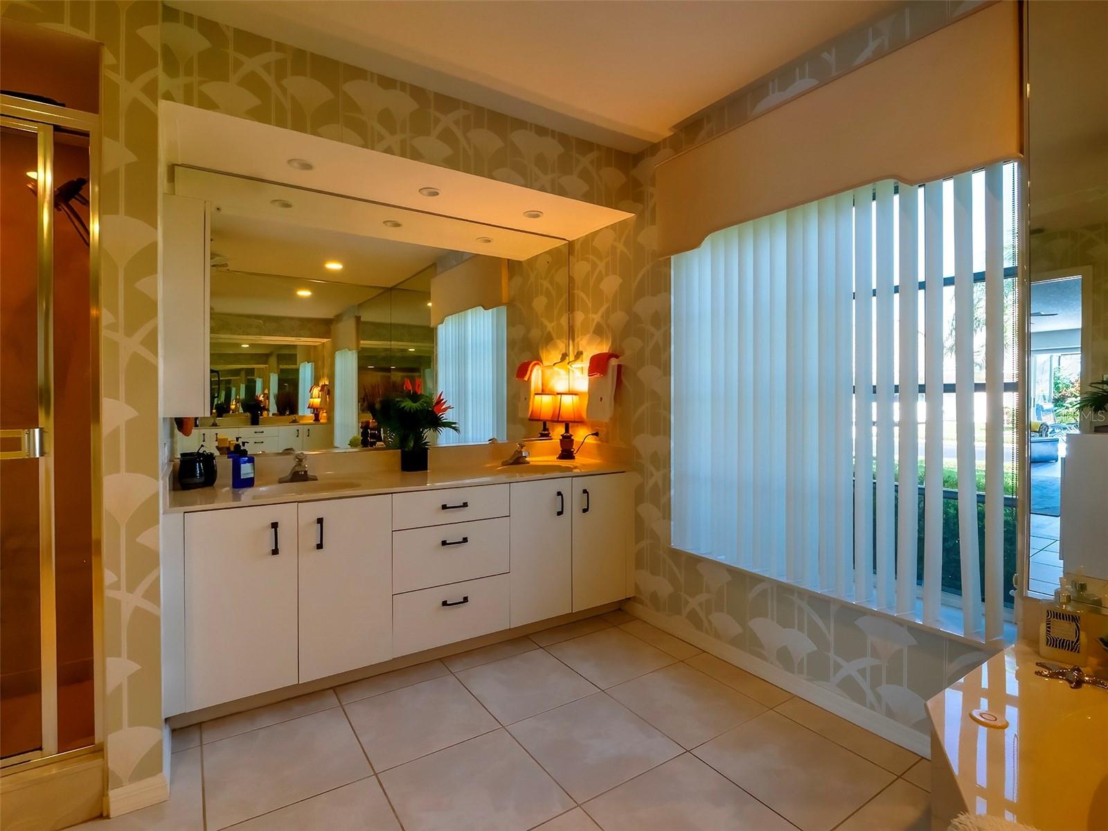 Spacious and thoughtfully designed, this 3 bedroom, 2 bath saltwater pool home features an expansive layout with generously sized rooms throughout. With over 90 feet of frontage and a side-entry garage, the home offers fantastic curb appeal. The spacious master suite features sliding doors that open directly to the pool deck, creating a seamless indoor-outdoor retreat. The en-suite bath offers a jetted garden tub, a walk-in shower, and dual vanities, providing both luxury and convenience. This home is filled with exceptional features, including a double-door entry, soaring cathedral ceilings, and a spacious eat-in kitchen with a breakfast bar and convenient pool pass-through. Additional highlights include elegant plantation shutters, a central vacuum system, separate living and family rooms, and a well-designed split-floor plan for added privacy and functionality. Hurricane shutters throughout provide added security. Step outside to your private oasis, where the sparkling heated saltwater pool overlooks the tropical lush landscape, providing both tranquility and privacy. Nestled in an outstanding gated golf course community with clubhouse, pool & spa, pickleball, tennis, and library, you'll enjoy easy access to shopping, medical facilities, downtown Venice, and the beautiful Gulf beaches. This home comes turnkey furnished- all you need to bring is your tooth brush. Luxurious entertainment room: watch your favourite sports and movies on the 65" tv with two high-end recliner sofas. Don't miss this exceptional opportunity!