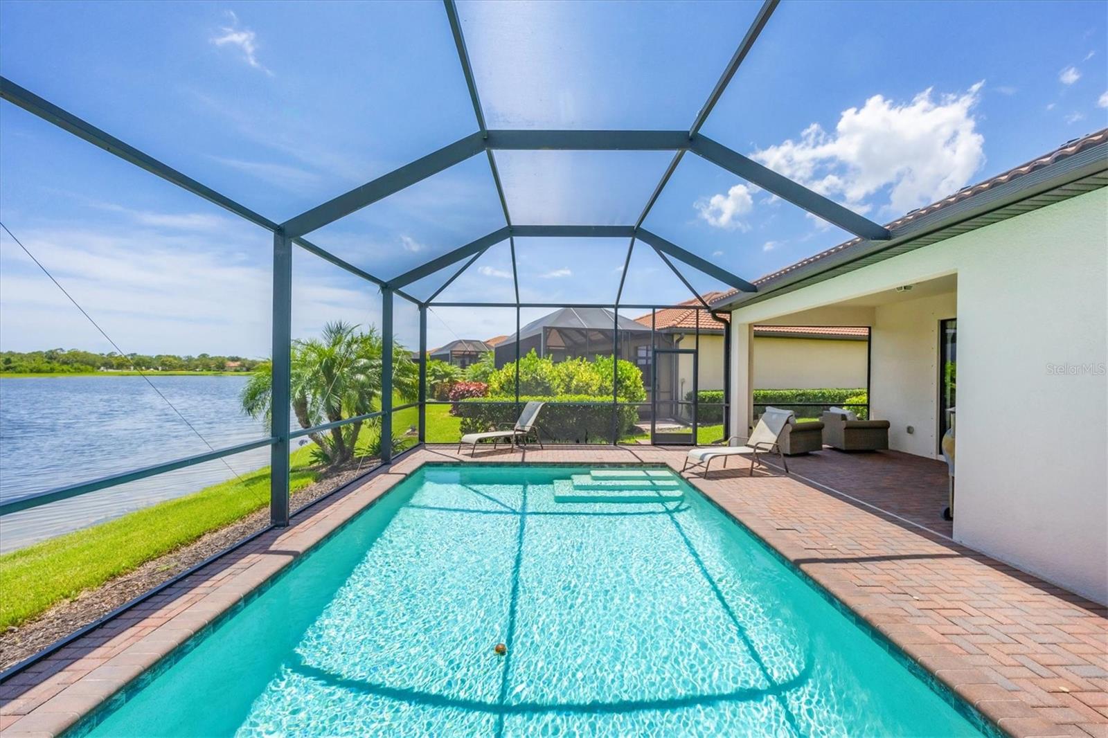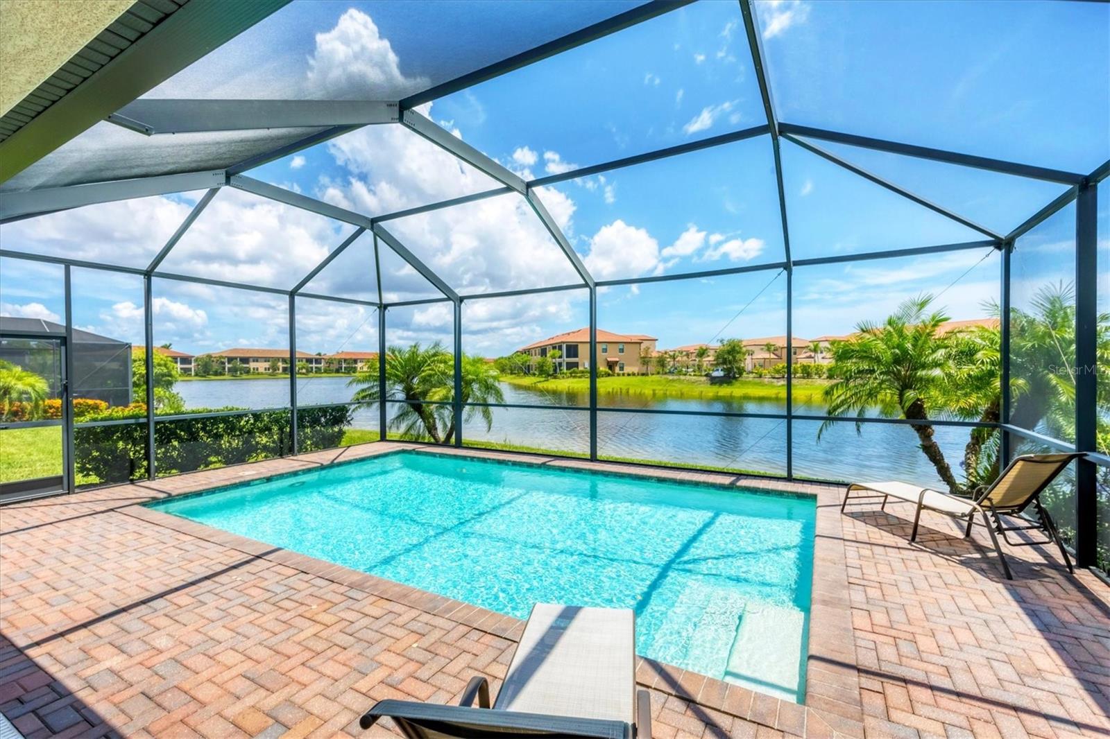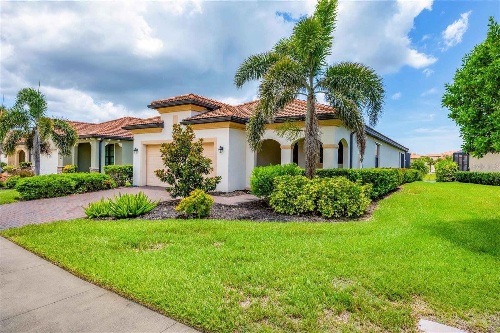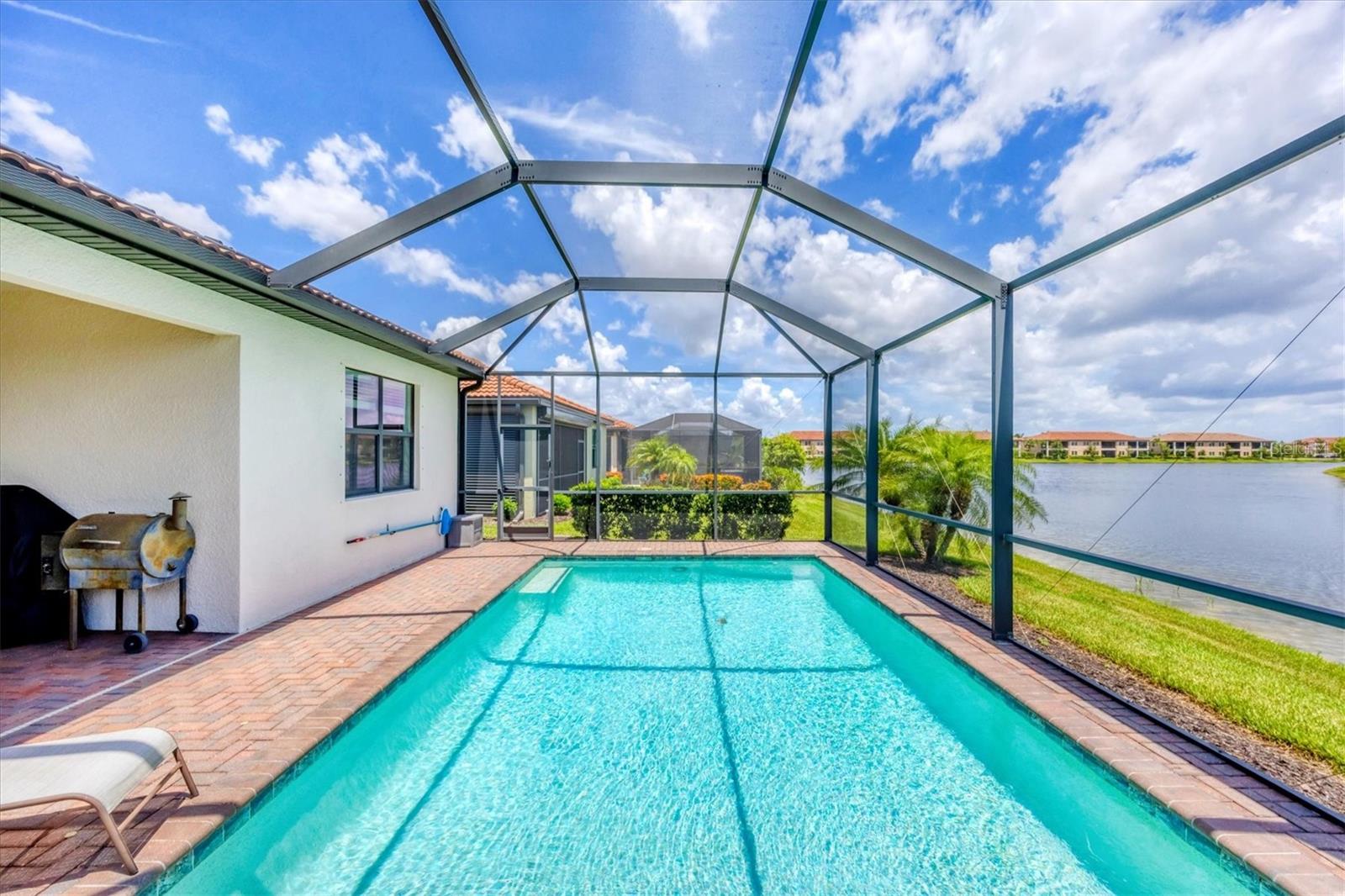 TRULY SPECTACULAR VIEWS!! Private pool and lanai overlooking lake views in all directions. SOUTHWEST EXPOSURE for sun all day long. PAVERED LANAI SURROUNDS SOLAR HEATED POOL. Looking for a little relaxation in the shade- sit on your front porch- a great place for reading a book and watching or engaging with the neighbors walking by. This Milan floor plan has 2BR/2BA and a SEPARATE FLEX ROOM that has multiple uses and can be whatever you prefer. Often used as an office space or den with a pull out sofa for extra guests. The large open great room is the heart of the home, combining living room, kitchen, and dining room areas together for cozy gathering or all out entertaining space. The whole home is enhanced with a Neutral, Warm decor, high ceilings, crown molding, and 8 foot doors. Gourmet kitchen offers GRANITE counters, STAINLESS STEEL appliances/upgraded refrigerator, extra recessed lighting, and Island perfect for eating breakfast or setting out hors d'oeuvres and wine. Tile flooring throughout the main rooms with carpets in the 2 bedrooms only. Spacious en suite master bedroom with 2 WALK IN CUSTOM BUILT closets. Master bath has dual sinks and walk in shower. Large Guest bedroom at other end of home for privacy. Separate laundry room with wash sink. HURRICANE SHUTTERS. Not in Florida to see it in person? Go to the 3D Walkthrough at : https://my.matterport.com/show/?m=heBGDXv4DTf Sarasota National is Venice's premier community, offering over 1,300 acres of preservation, conservation, lakes, and open spaces with breathtaking views. As an Audubon International Certified Sanctuary, it provides the perfect backdrop for the community's 18-hole championship golf course. Enjoy resort-style amenities, including a huge pool and spa, Tiki Bar, tennis courts, pickle ball, bocce courts, a 7000 sq. ft. fitness center, a 30,000 sq. ft. clubhouse with dining and incredible views, and a coffee lounge/library/card room/meeting place. Plus, there's a day spa for relaxation. The community is just minutes from the new Wellen Park shopping area and Atlanta Braves stadium, with Venice Beach and downtown Venice only a short drive away. Whether you enjoy dining, shopping, or outdoor activities, this location has it all. Live the Florida lifestyle and make every day feel like a vacation! Schedule your tour today! BE AWARE, hitting the "contact agent"button on Zillow or 3rd party websites will NOT take you to the person who has the house on the market. SEE THIS GREAT HOME TODAY and FIND YOUR FLORIDA LIFESTYLE!