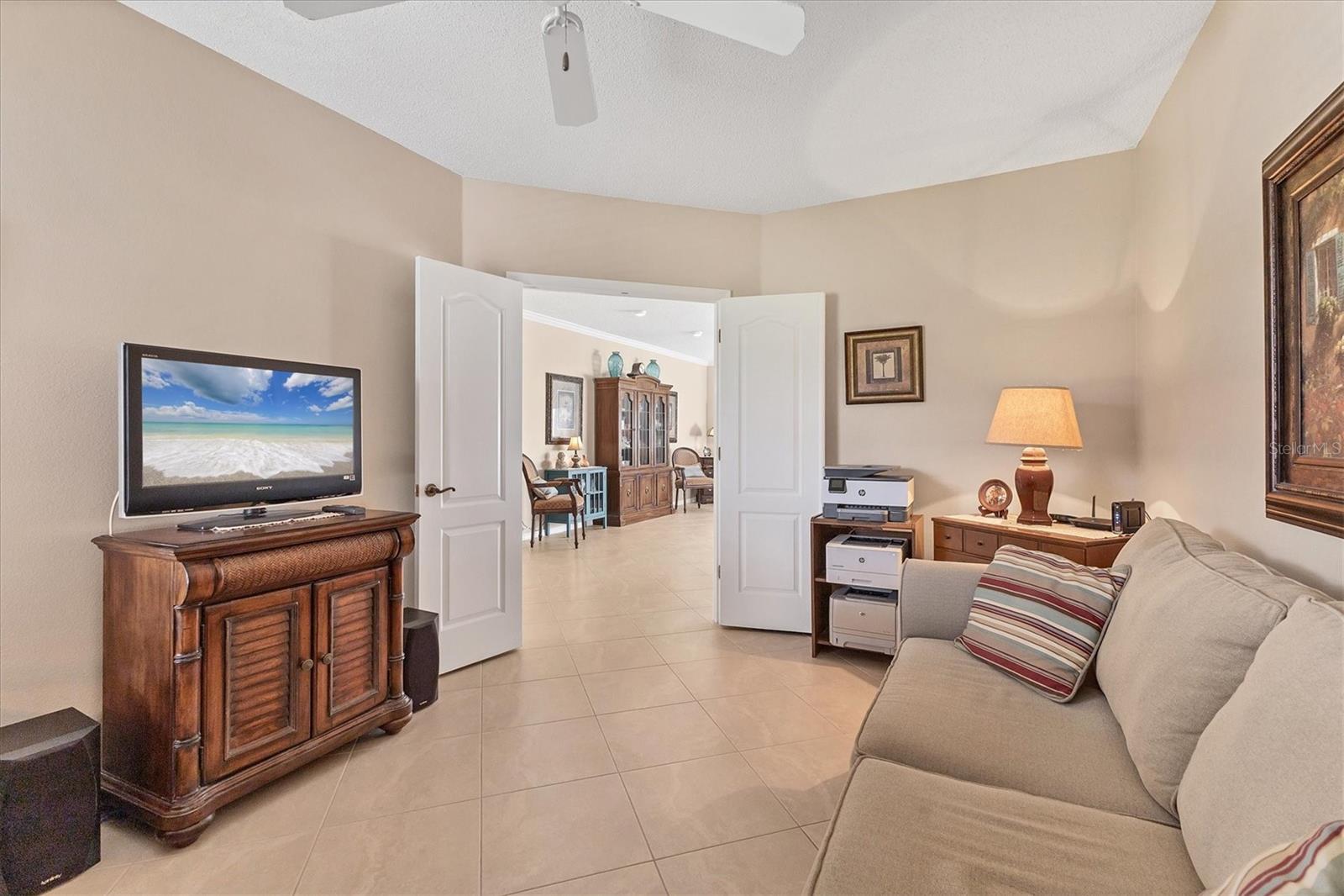 Welcoming Two Bedroom plus Den/Office with French Doors, Two Bath, and Two car garage in a well-designed split floor plan for added privacy and functionality. This 1,932 Sq Ft home offers an additional 9 x 21 enclosed lanai to expand your living area. A paver walkway leads you to an outside paver patio with an exceptional view of the 8th green of the Turnberry Course. Colony Place is a small community of 36 homes located within the Gated, Deed Restricted Championship Waterford Golf and Tennis Community. The home features an open concept with a large great room and dining area open to the kitchen. You will see 18 x 18 Porcelain Tile on the diagonal through-out, (no carpet here). 9 foot ceilings and crown molding adds to the finished look of this thoughtfully designed home. Disappearing three panel glass sliders opens to the lanai. The kitchen has a large counter level breakfast bar plus a separate eat-in area, newer appliances, double door closet pantry, and an abundance of cabinets and counter space. The convenient inside laundry room has upgraded washer/dryer, cabinets and storage closet. The large primary bedroom with cozy sitting area has sliders open to the lanai. The en suite has a whirlpool jetted garden tub, walk-in shower, dual vanities, and private water closet. An extra large walk-in closet provides ample hanging and storage space. The generous size guest bedroom is separated offering privacy, and has an additional walk-in closet. The adjacent bathroom has a walk-in shower. Colony Place is a maintenance free community with lawn and shrubbery care, irrigation, roof and driveway pressure cleaning, and exterior home painting. The heated community pool is a great gathering spot. The vibrant Waterford Community offers an active lifestyle with picturesque views and a serene atmosphere. You will enjoy convenient shopping, restaurants, medical facilities, historic downtown Venice, and the beautiful Gulf beaches. In addition, close-by MLB Spring Training Park, and an abundance of area amenities to enhance your Florida living experience.Waterford Sports Club is included in your HOA fees and features a club house, fitness center, library, activity room, resort style heated pool, 4 lighted Har-Tru Tennis Courts, Half Court Basketball Court, and coming soon Pickle Ball Court.Waterford Golf Club is semi private and features 27 holes of challenging golf. The golf club is complete with a well stocked pro shop, driving range, and restaurant. Membership is optional and is not required for homeownership in the community.Come take a look at this spacious light and bright home with a great golf course view. It just may be your next home.