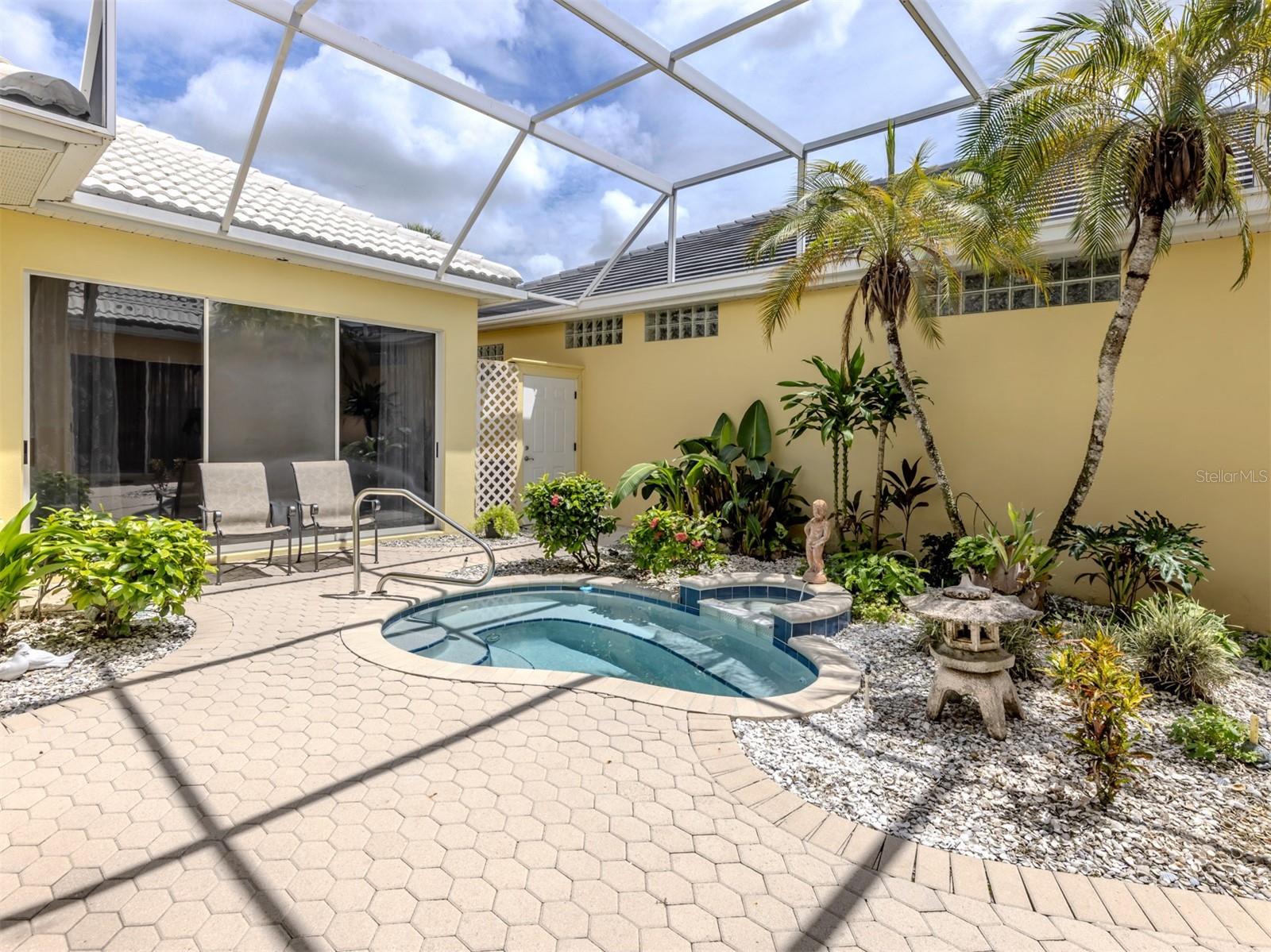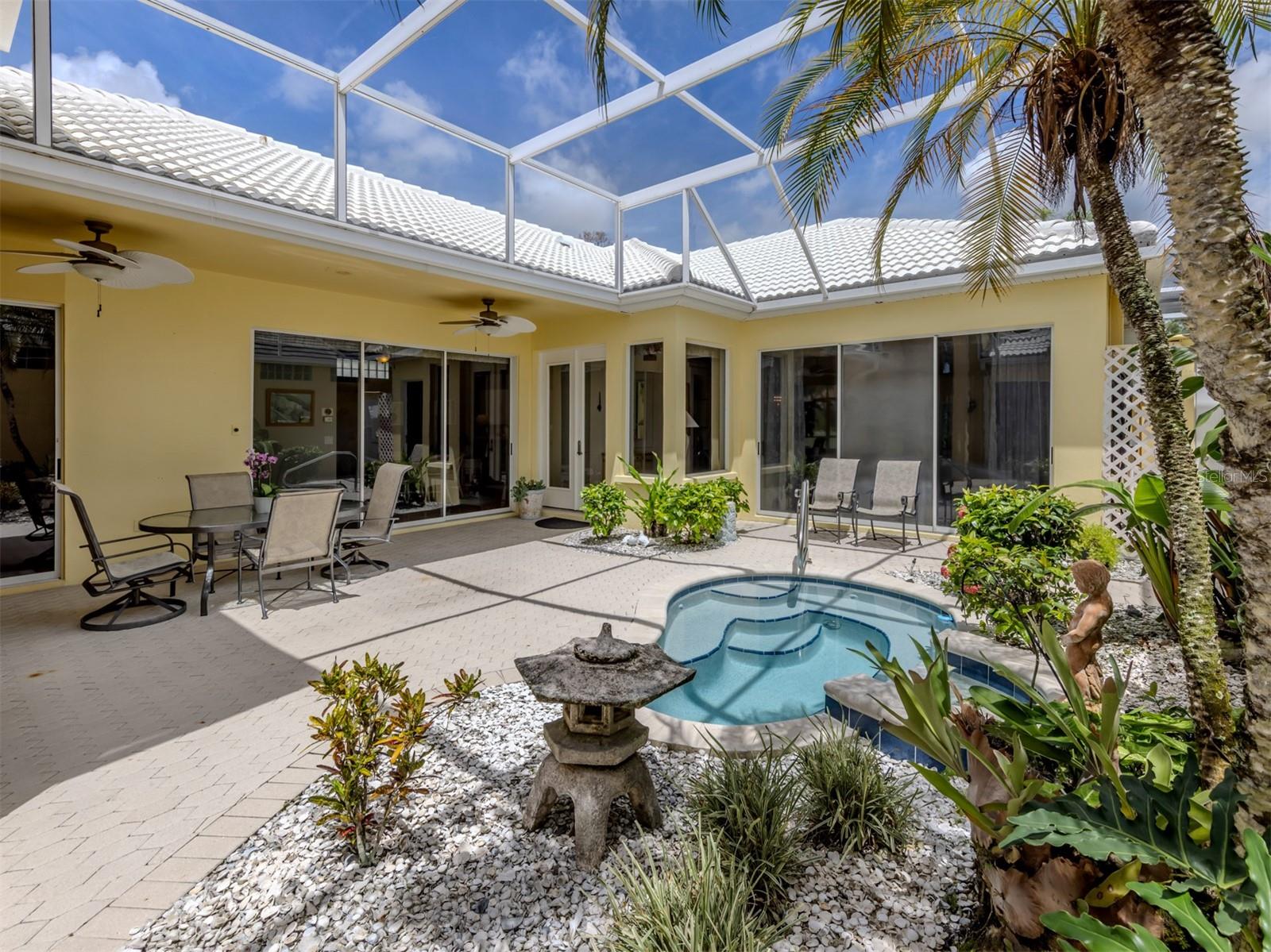 Positioned along the third fairway of The Venice Golf & Country Club, you'll find this courtyard home surrounded by lush tropical landscaping. In a maintenance-free neighborhood with its own neighborhood pool, this residence offers a bright, open layout enhanced by abundant windows and sliding glass doors, blending indoor comfort with the relaxed charm of outdoor living. Enjoy your private courtyard, ideal for relaxing or entertaining in Florida style, featuring a refinished spa. Primary suite offers a bay window, walk-in closet and en-suite bath. Guest bedroom with bath opens to the courtyard via sliding glass doors and the separate cabana room has its bath. This home is turnkey with a few exceptions, and a golf membership is also available. Discover the unparalleled lifestyle of The Venice Golf and Country Club where extraordinary living begins. Recently reimagined, the expanded clubhouse features a spacious gathering bar, gourmet and commercial kitchens, and a cozy fire pit. The new state-of-the-art Wellness Center provides a holistic approach to health and well-being. Residents enjoy a beautifully renovated Ted McAnlis-designed 18-hole championship golf course, Har-Tru tennis courts, pickleball, bocce ball, and a Junior Olympic-sized pool and spa, balancing active living with relaxation. As a proud Geo-Certified Audubon Cooperative Sanctuary, VGCC embraces environmental stewardship and sustainability. With an A-plus financial rating, the community is as solid as it is serene. It's ideally just minutes from airports, shopping, dining, Interstate 75, cultural venues and Wellen Park. It's also a short drive to the charming Island of Venice, where 14 miles of pristine beaches meet the sparkling Gulf Coast.