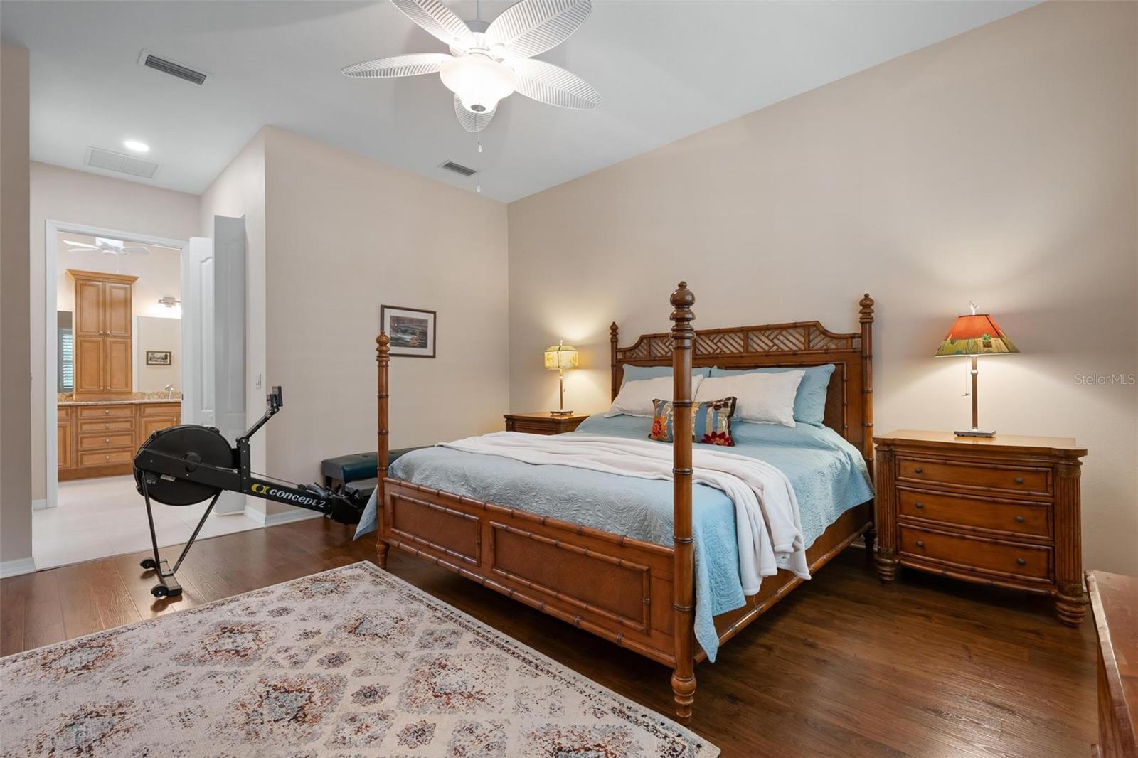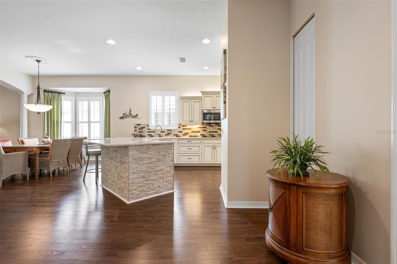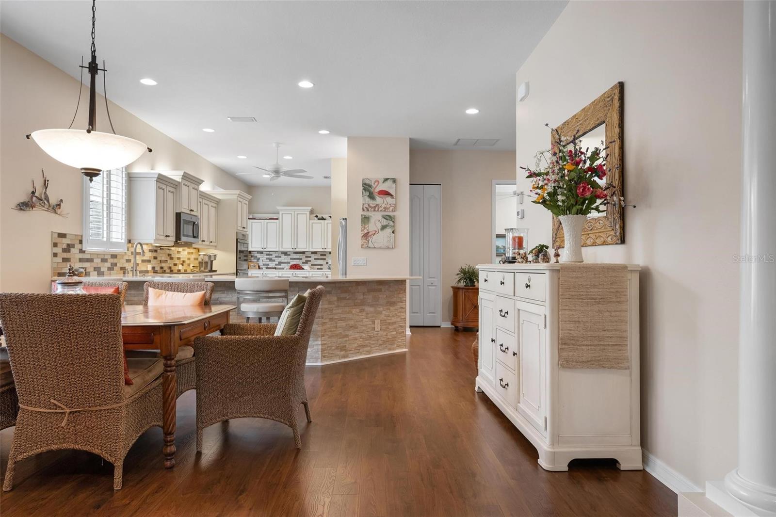 Privacy meets Convenience in this Hidden Retreat. Beautifully cared for and maintenance free, this home is ideally positioned near the end of a quiet cul-de-sac in the enclave of St. Andrews East at Plantation Golf & Country Club. Designed with a sunlit open layout and coveted southern exposure, the residence offers a seamless blend of elegance and comfort. The kitchen is a showpiece with canvas-toned cabinetry accented by cocoa highlights, quartz countertops, multiple deep drawer banks, glass tile backsplash, under-cabinet lighting, granite sink, and stainless steel appliances including a double wall oven and induction cooktop.The expansive great room impresses with a trayed ceiling, crown molding, 8-foot interior doors, and plantation shutters, all leading to a wall of sliders that open to the generous lanai and pool. A covered outdoor living area overlooks the extremely private heated saltwater pool and the lush Florida landscape beyond. The luxurious primary suite features dual walk-in closets and a spa-inspired ensuite bath with dual sinks and a curbless walk-in shower.This residence is equipped with excellent storm protection, including impact-resistant windows, accordion shutters, and a security system. Additional highlights include a finished garage, extra laundry cabinetry, and a whole-home water filtration system.For those seeking an active lifestyle, the Plantation Golf & Country Club offers two championship golf courses, pickleball, tennis, a resort pool with a cabana bar, a fitness center, and a variety of dining options, all supported by a vibrant social calendar. Optional memberships are available. Conveniently located just 15 minutes from Gulf beaches, historic downtown Venice, downtown Wellen Park, and abundant shopping and dining, this home perfectly combines privacy, style, and convenience.