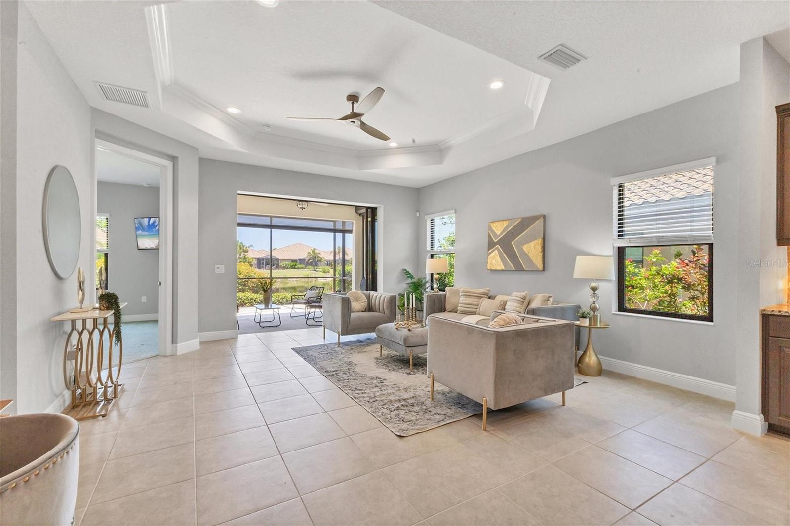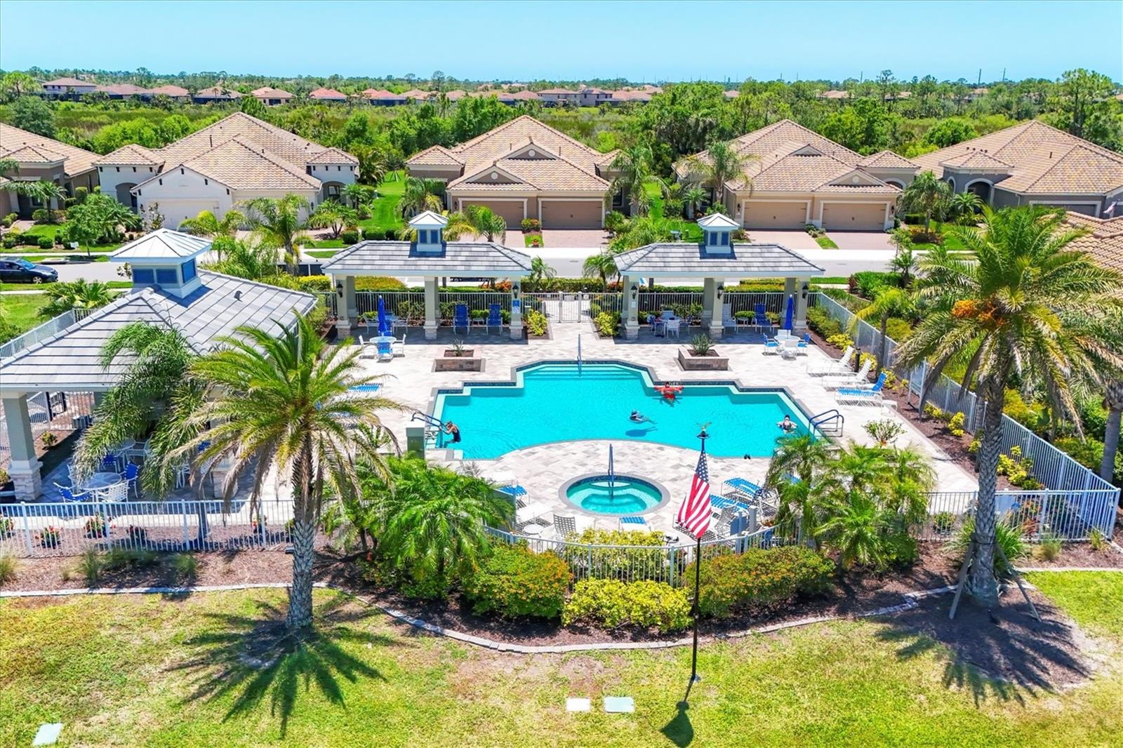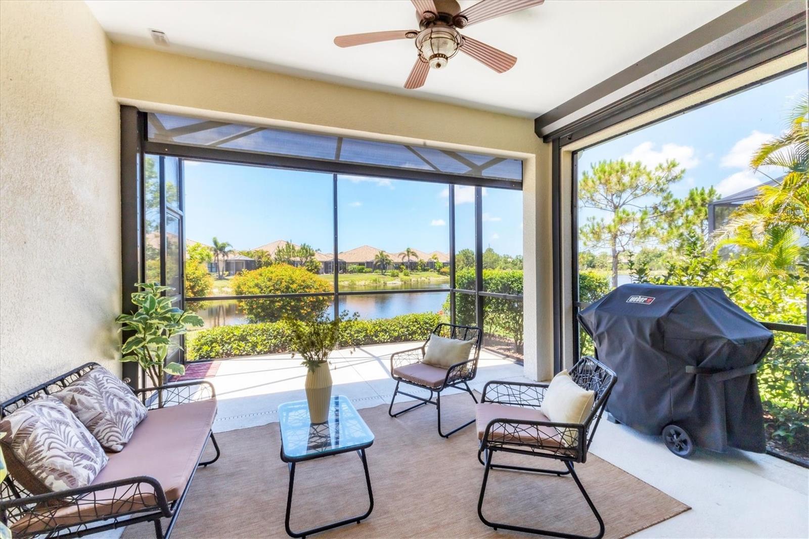 Seller Concessions with this beautiful lakefront Villa, in the amenity-rich Grand Palm community, presents a refined living experience with a surplus of upgrades. The western-facing extended lanai provides the most beautiful sunsets glistening on the lake, making every evening a masterpiece to enjoy. Meticulously maintained, this home offers a blend of comfort and technology, designed for contemporary living. Exterior features include Storm Smart automatic hurricane screens on the extended lanai, providing protection with touch of a button. The professionally landscaped front, side and rear yards, complete with custom-molded curbing, enhance the overall appeal. A gas stub is installed on the lanai for outdoor grilling, and a digital front door lock with an integrated camera adds security and convenience. The garage is equipped with a utility sink, offering additional functionality. Inside, smart upgrades contribute to comfort and peace of mind. A monitored alarm system allows for app-controlled access to the thermostat, front door, garage and home cameras. Whole-house surge protection at the electric panel provides confidence during storm seasons. The interior showcases coffered ceilings with crown molding, faux cordless blinds, and ambient recessed lighting in the great room and kitchen. The kitchen features granite countertops, a high-bar island, warm cherry cabinetry with crown molding, satin nickel hardware, recessed and pendant lighting, and a modern horizontal tile backsplash. The guest and primary baths are appointed with floor-to-ceiling ceramic tile shower enclosures, custom cherry cabinetry, satin nickel hardware and Corian vanity countertops. Whisper-quiet Panasonic exhaust fans with electric timers contribute to efficiency. Additional features include a custom Murphy bed in the flexible den/office, offering versatile space for extra guests. The primary suite provides a custom-installed wood door enclosure separating the bedroom from the bath, creating a distinct retreat. This home combines elegant living with practical, smart features. Included with the purchase are two mounted televisions and a natural gas Weber patio grill. This villa is a short distance from the neighborhood pool and a quick ride to the other community amenities. A full-time activity coordinator provides an active calendar each and every month along with a fully equipped fitness center, three additional community pools, pickleball, tennis, basketball, volleyball, and miles of walking and biking trails. There's never a shortage of things to keep you busy. This home is ready for its new owners and priced to sell, so schedule your private showing today.