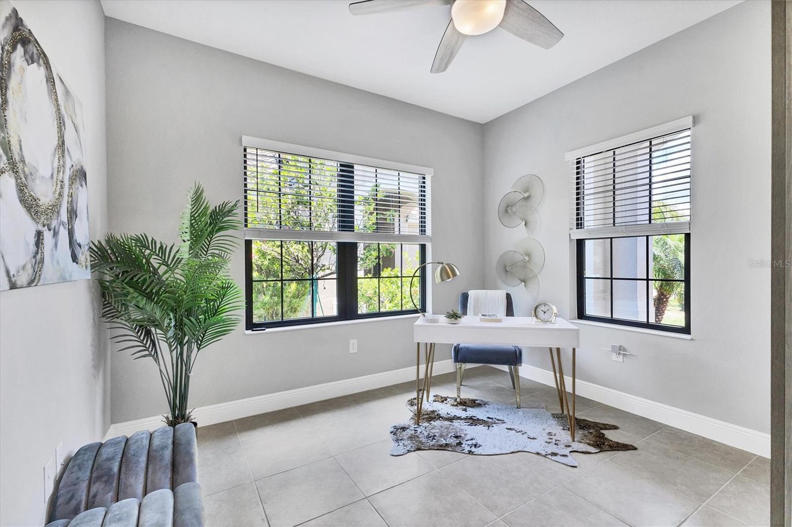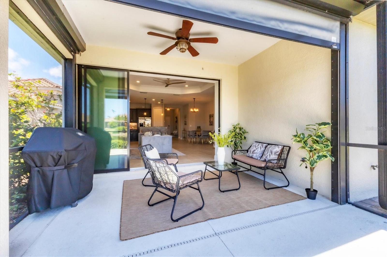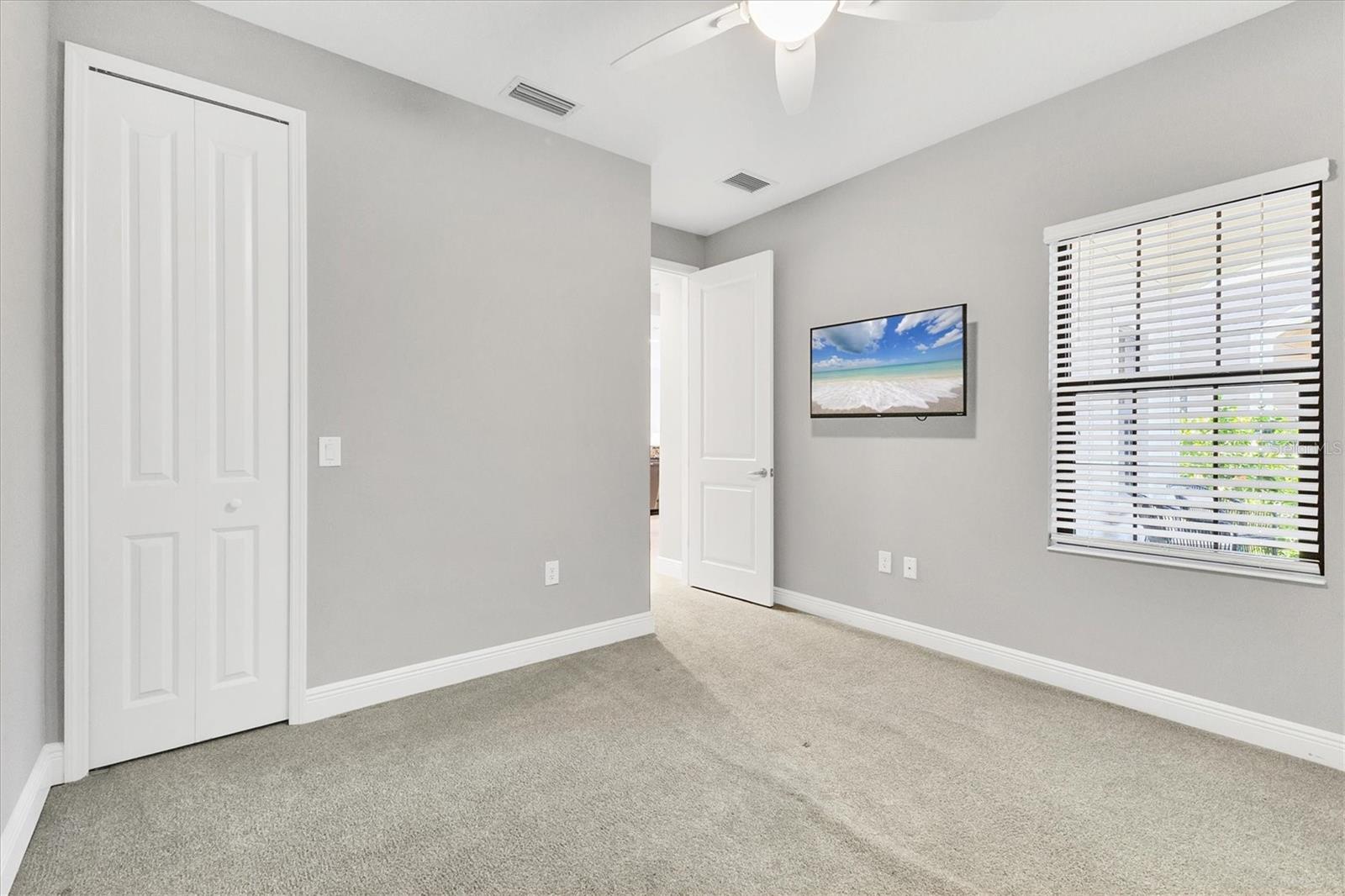 Seller Concessions with this beautiful lakefront Villa, in the amenity-rich Grand Palm community, presents a refined living experience with a surplus of upgrades. The western-facing extended lanai provides the most beautiful sunsets glistening on the lake, making every evening a masterpiece to enjoy. Meticulously maintained, this home offers a blend of comfort and technology, designed for contemporary living. Exterior features include Storm Smart automatic hurricane screens on the extended lanai, providing protection with touch of a button. The professionally landscaped front, side and rear yards, complete with custom-molded curbing, enhance the overall appeal. A gas stub is installed on the lanai for outdoor grilling, and a digital front door lock with an integrated camera adds security and convenience. The garage is equipped with a utility sink, offering additional functionality. Inside, smart upgrades contribute to comfort and peace of mind. A monitored alarm system allows for app-controlled access to the thermostat, front door, garage and home cameras. Whole-house surge protection at the electric panel provides confidence during storm seasons. The interior showcases coffered ceilings with crown molding, faux cordless blinds, and ambient recessed lighting in the great room and kitchen. The kitchen features granite countertops, a high-bar island, warm cherry cabinetry with crown molding, satin nickel hardware, recessed and pendant lighting, and a modern horizontal tile backsplash. The guest and primary baths are appointed with floor-to-ceiling ceramic tile shower enclosures, custom cherry cabinetry, satin nickel hardware and Corian vanity countertops. Whisper-quiet Panasonic exhaust fans with electric timers contribute to efficiency. Additional features include a custom Murphy bed in the flexible den/office, offering versatile space for extra guests. The primary suite provides a custom-installed wood door enclosure separating the bedroom from the bath, creating a distinct retreat. This home combines elegant living with practical, smart features. Included with the purchase are two mounted televisions and a natural gas Weber patio grill. This villa is a short distance from the neighborhood pool and a quick ride to the other community amenities. A full-time activity coordinator provides an active calendar each and every month along with a fully equipped fitness center, three additional community pools, pickleball, tennis, basketball, volleyball, and miles of walking and biking trails. There's never a shortage of things to keep you busy. This home is ready for its new owners and priced to sell, so schedule your private showing today.