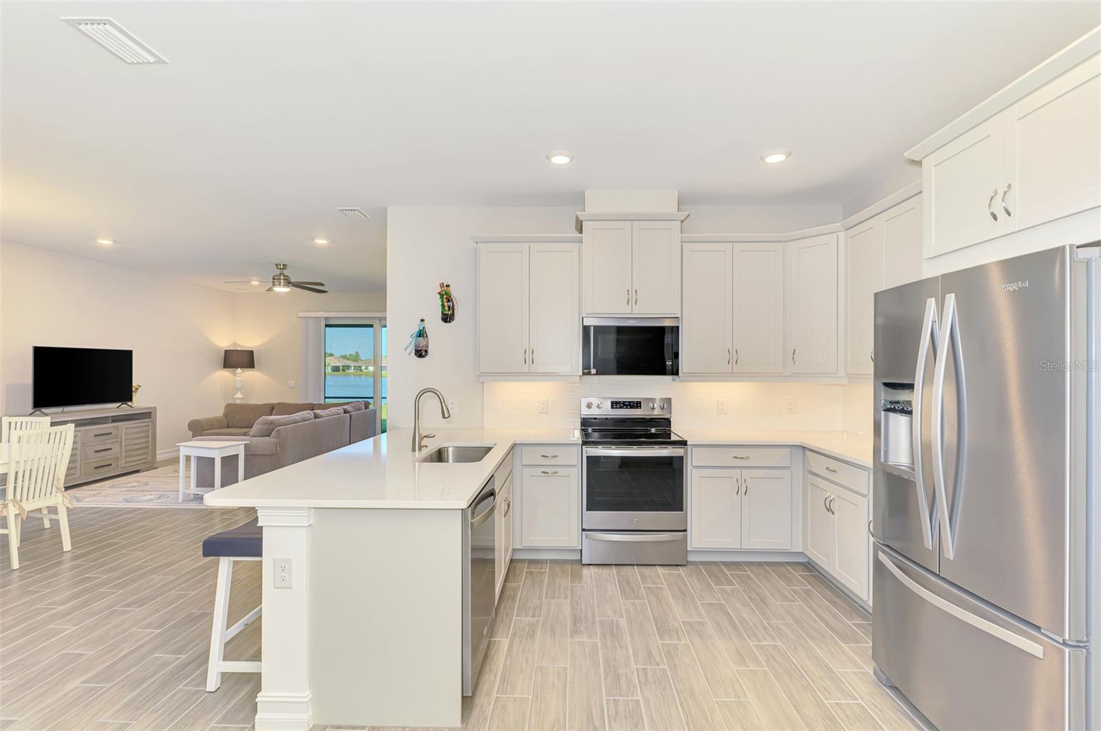 Welcome to this like-new WATERFRONT villa in the highly desirable Palencia community of North Venice! With low monthly fees and no CDD, this home shows great long term value. This well-maintained 2-bedroom, 2-bathroom villa includes a spacious den featuring glass French doors for additional flexibility and privacy. The open-concept floor plan showcases beautiful water views throughout! High end features including ALL IMPACT windows and glass sliding doors for peace of mind. A chef-inspired kitchen with quartz countertops, tile backsplash, stainless steel appliances, under-cabinet lighting, and soft-close cabinetry with pull-out drawers. Two separate kitchen pantries including one upgraded with California closets. Tile plank flooring throughout all the main living areas, den, kitchen, and bathrooms. The primary bedroom is large with newer luxury vinyl plank flooring, en-suite bath with walk in shower, and a generous walk-in closet updated with California closets for great storage. Step outside to your cozy lanai, perfect for enjoying Florida's sunshine and wonderful lake views. Other great updates include new screens and frames for all windows, gutters around whole villa, remote control fans throughout, and SMART home features including doorbell, thermostat, front door lock, and garage opener. Palencia is a great low cost and maintenance free community featuring lawn care PLUS a wonderful community pool with clubhouse and fitness. The community also features bocce ball, walking trails, and multiple dog runs. A convenient North Venice location with quick access to i75, shopping, and dining. Plus quick access to Downtown Venice and Gulf Coast Beaches. Don't miss the chance to make this waterfront retreat your new home. Schedule your showing today!