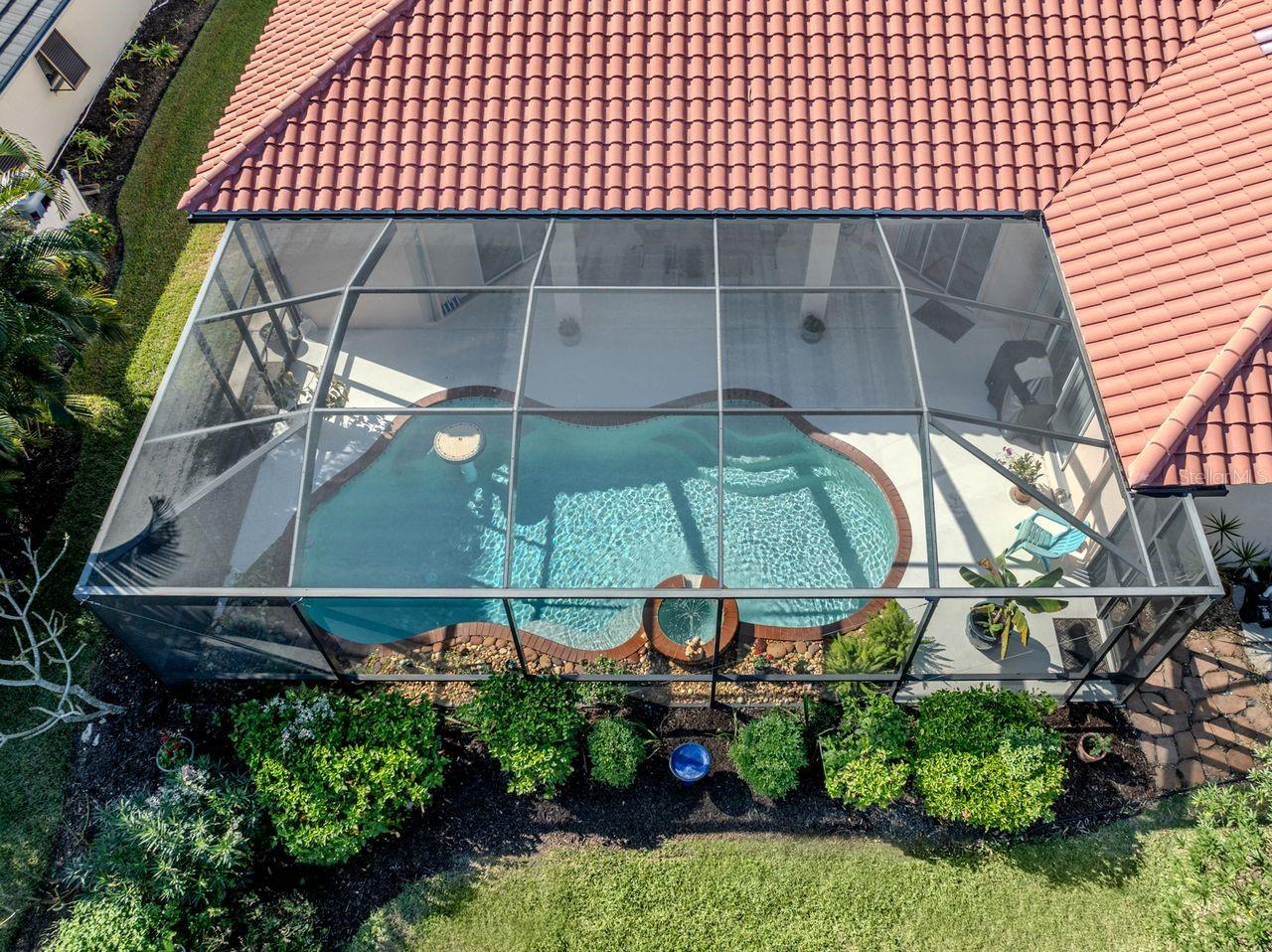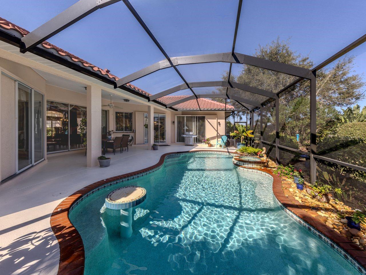 Under contract-accepting backup offers. PRICE IMPROVEMENT! Stunning custom J&J built 3 bedroom, 2 bath, 2 car garage 2400+ SF home on large lot. Experience quality & comfort in this spacious home 2400+ SF of living space with 10 FT ceilings throughout. Extra large beautifully renovated kitchen featuring custom cabinetry, a large Island, designer backsplash, and a generous pantry- perfect for entertaining or family gatherings. Separate living room, dining room plus expansive family room has an inviting open plan. Large, relaxing primary suite has Roman shower, and his & her walk-in closets. Enjoy peace of mind, with NEW HVAC SYSTEM with extra insulation for energy efficiency- 2025. All vents & ductwork cleaned & sanitized for allergens - 2025. NEW TILE ROOF -2023, POOL CAGE -2023, gorgeous custom double entrance doors -2023 and exterior house freshly painted -2025. House also wired for generator. Step outside to your private oasis with 14x28 HEATED pool with fountain & BUILT-IN TABLE with jets, surrounded by lush landscaping for privacy & relaxation. A warm inviting move-in ready home! Desirable community with Clubhouse, community junior olympic pool, tennis & pickleball courts, sparkling lakes & walking/biking trails. Low HOA fee & no CDD fee. Great location to historic downtown Venice, Gulf of Mexico beaches, Golf courses, fine dining, shopping, the Atlanta Braves baseball stadium & I-75.