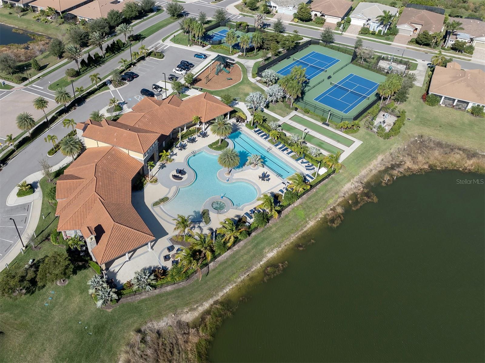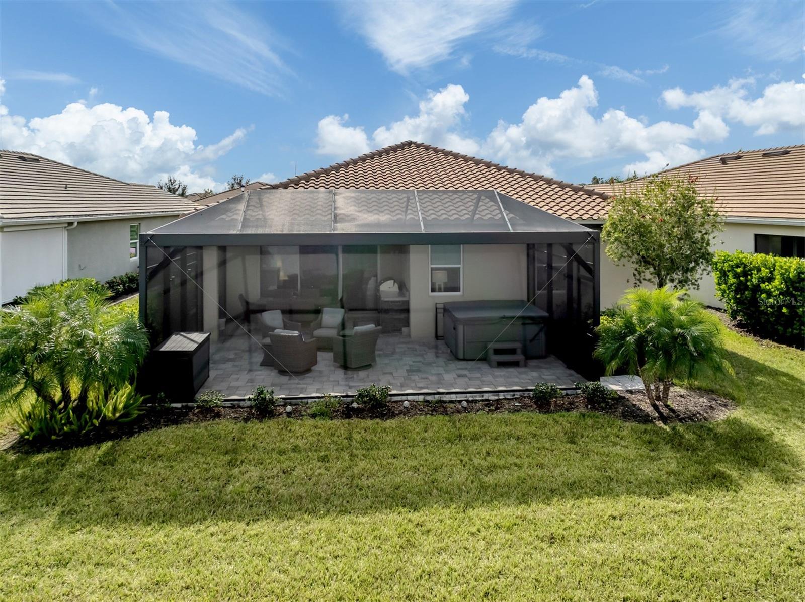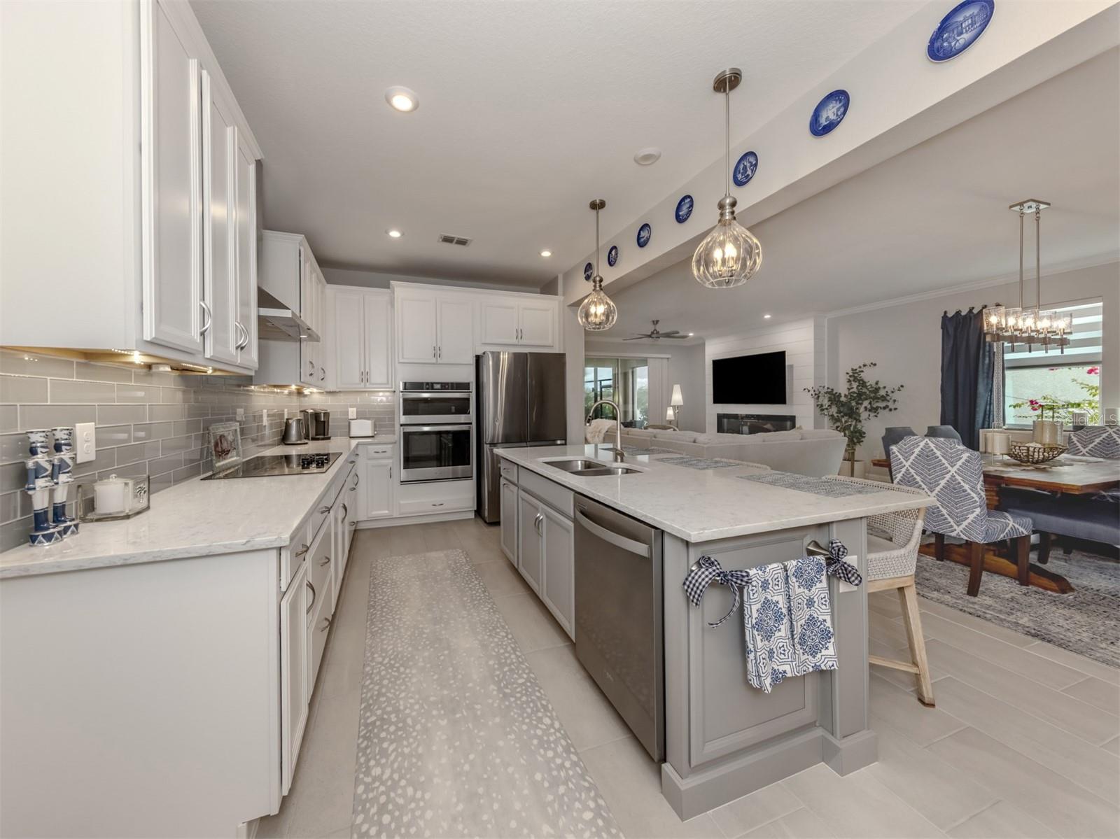 This sun-lit, meticulously cared-for home offers both style and serenity, with premium upgrades and breathtaking water views. Impeccably maintained Antigua II model, offering 2,182 square feet of bright, sun-filled living space in the highly sought-after gated community of Renaissance at Wellen Park. Featuring 3 bedrooms, 2 full baths, den/flex room, and a 2-car garage, this great-room-style home blends comfort, elegance, and modern design. Step inside through the beautiful glass entry door into a spacious foyer, setting the tone for the refined interior. Tile flooring flows throughout the main living areas, enhancing the home's open and airy feel. At the heart of the home is the expansive chef's kitchen, complete with solid wood cabinetry, quartz countertops, wall oven, built-in cooktop, breakfast bar, and a large custom walk-in pantry offering an abundance of extra storage. The kitchen seamlessly connects to the dining area and great room, making entertaining effortless. The great room features a custom built-in electric fireplace and wide sliding glass doors that open to the oversized lanai. The owner's suite, located at the rear, creates a private oasis and includes a spacious walk-in closet with custom built-in shelving, a linen closet, and a luxurious en suite featuring dual sinks, solid wood cabinetry, quartz countertops, an oversized glass walk-in shower, and a private water closet a true retreat. The two well-appointed guest bedrooms are located on the front of the home and near the second full bath and include plenty of privacy and space for family or guests. The laundry room, conveniently located off the kitchen, includes a utility sink and custom built-in space for the washer and dryer. Out back, discover your private oasis with an extended lanai overlooking long, tranquil water views enhanced by a clear-view screen. The custom outdoor kitchen with Bull appliances and a large hot tub creates the perfect space to unwind after a day at the beach or clubhouse. Behind its gates, the Renaissance community includes a resort-style heated pool, spa, tennis and pickleball courts, bocce, a fitness center, playground, and more. The nearby nature trails lead to the Blue Heron Park. The low monthly fees cover ground maintenance and all amenities. Near the Atlanta Braves spring training ballpark, downtown Wellen Park, Costco, dining, shopping, medical facilities, U.S. 41, Interstate 75 and pristine beaches of the beautiful Gulf! **See FEMA LOMR in MLS - NO FLOOD INSURANCE REQUIRED***