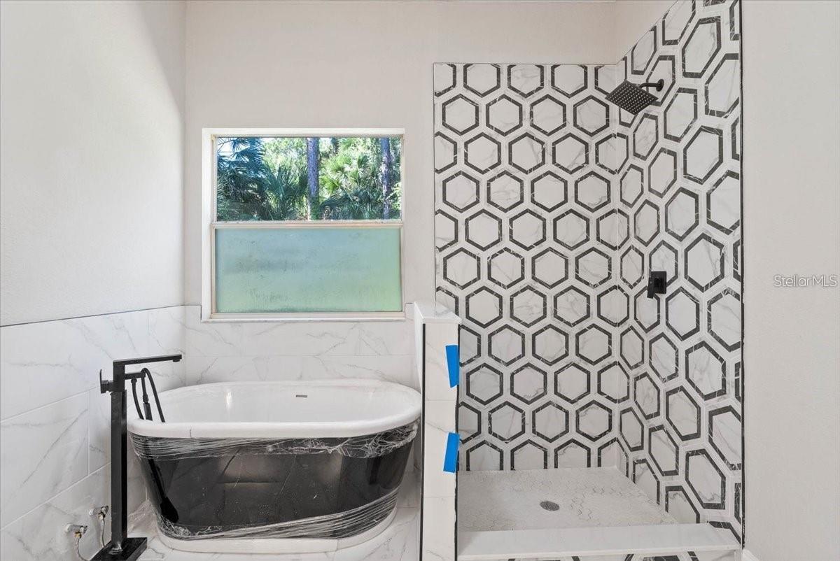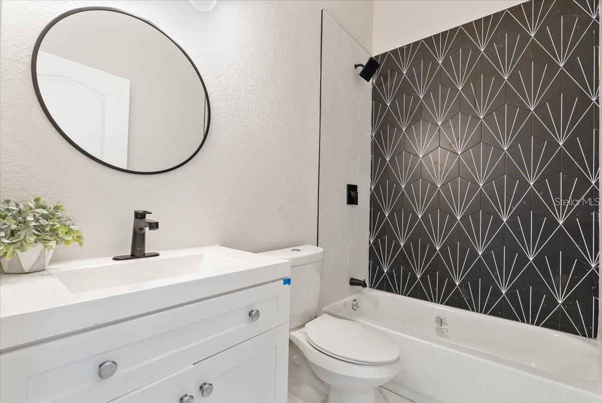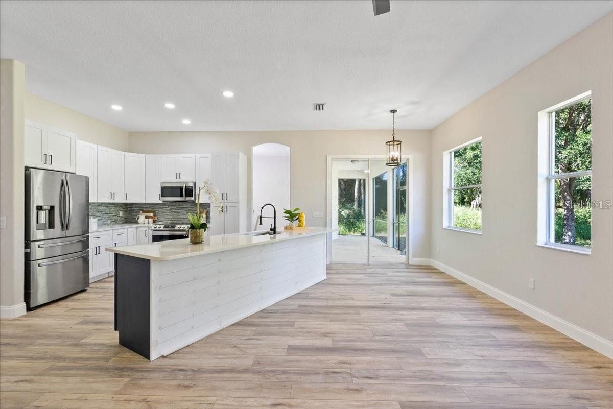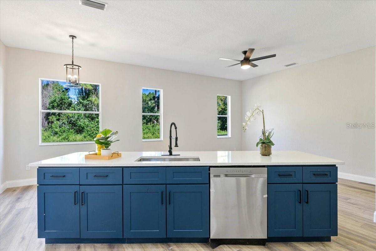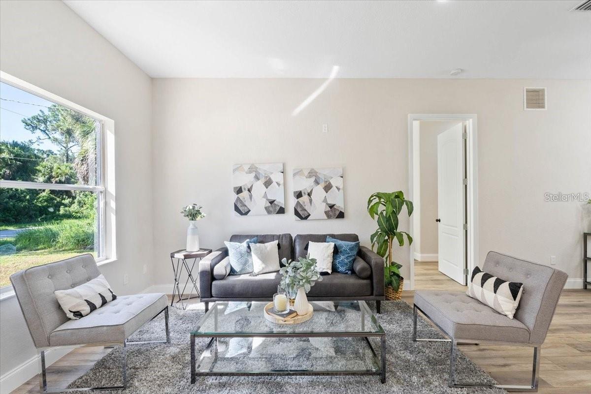 Located in the sought-after North Port area, this fully renovated 3-bedroom, 2-bathroom home is a standout. It features a new roof, A/C, garage doors, fresh paint inside and out, and new luxury vinyl flooring throughout. The stunning kitchen boasts a blue island with radiant quartz counter- tops, 26-inch shaker-style cabinets, and a beautiful glass backsplash. The spacious family and dining rooms are filled with natural light. The primary bedroom accommodates a king-size bed with ample space. The updated bathrooms feature mosaic-tiled showers, a freestanding clawfoot tub, and new mirrors, light fixtures, and vanities.